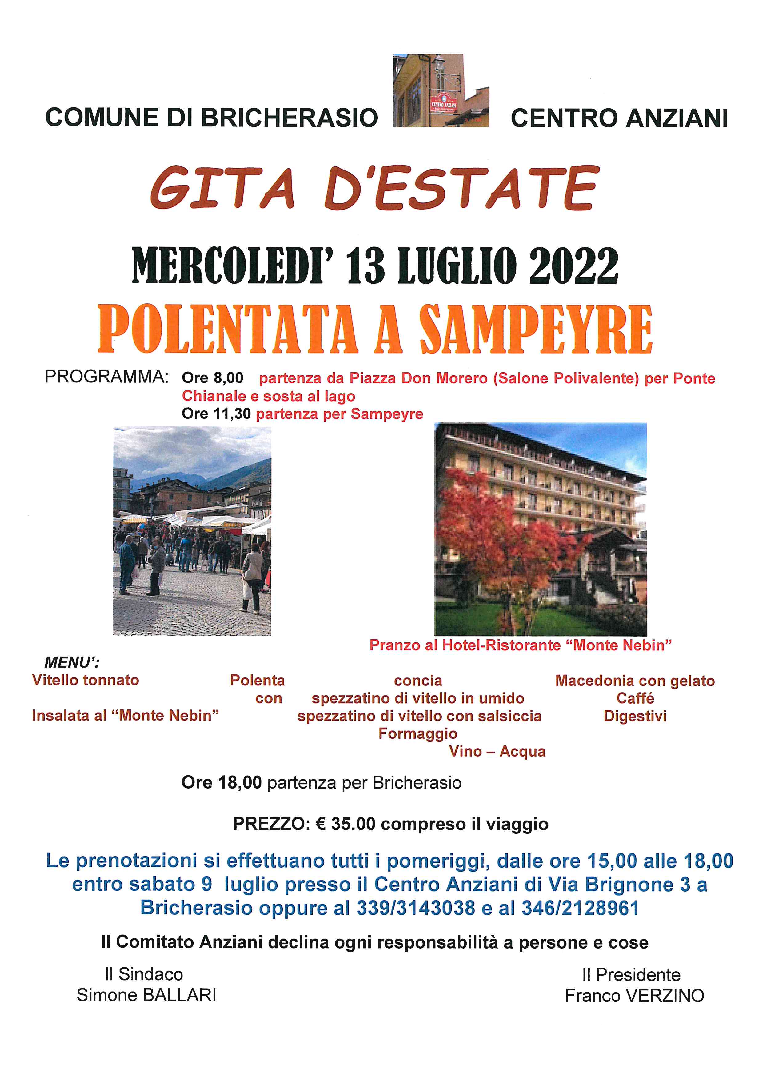 Il Centro Anziani di Bricherasio, in collaborazione con il Comune, organizza la gita d’estate per la tradizionale polentata mercoledì 13 luglio a Sampeyre. Il programma prevede alle ore 8 la partenza dal Salone Polivalente di Piazza Don Morero di Bricherasio per Pontechianale e sosta al lago. Alle 11,30 la comitiva si reca a Sampeyre per il pranzo all’hotel ristorante “Monte Nebin”. Alle 18 il commiato per il ritorno a Bricherasio. Informazioni e prenotazioni entro sabato 9 luglio tutti i pomeriggi, dalle ore 15,00 alle 18,00 al Centro Anziani di Via Brignone, 3 a Bricherasio oppure telefonando ai numeri 339/3143038 oppure 346/2128961. Il costo è fissato in € 35 a persona comprensivo del viaggio in pullman.