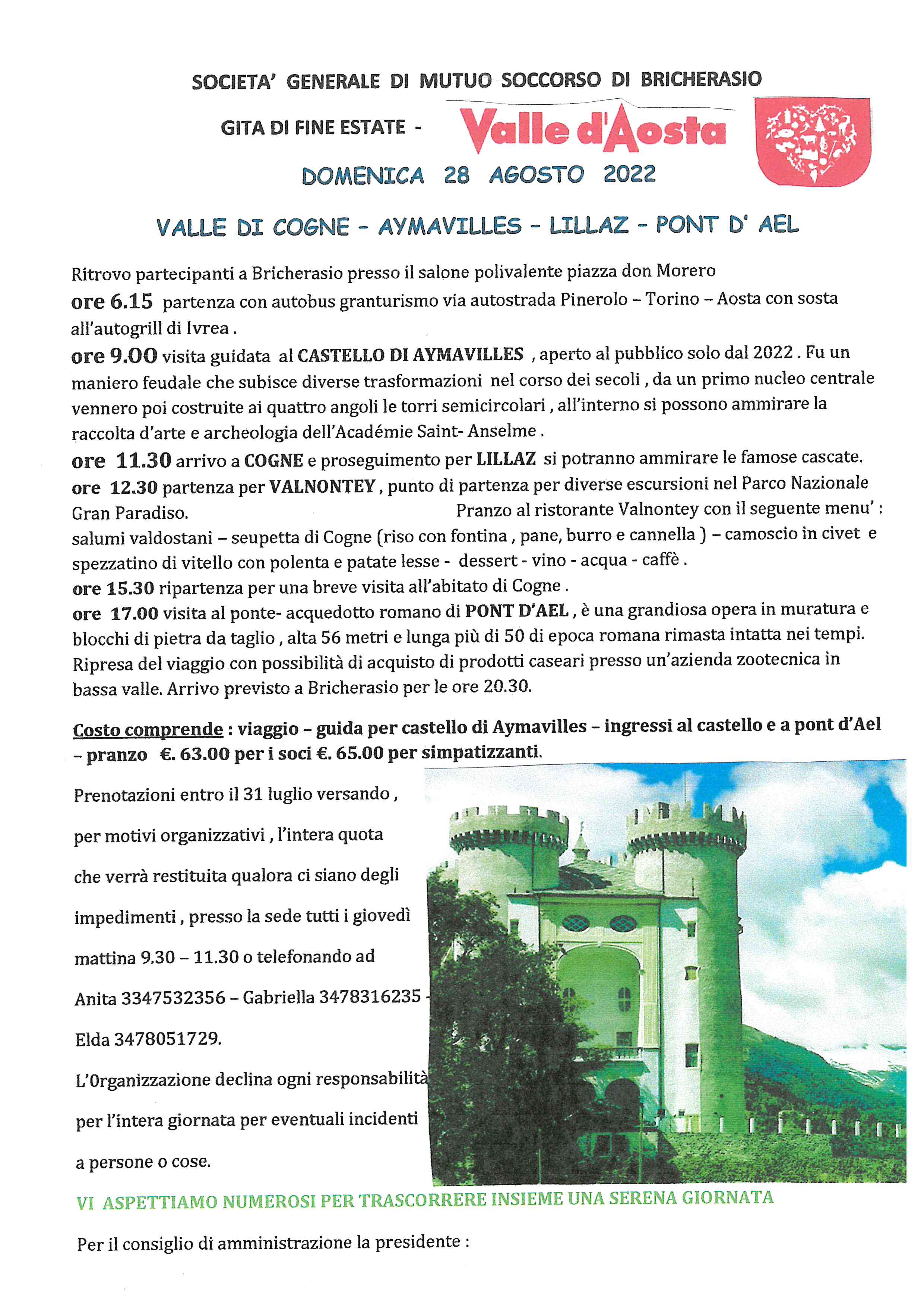 Il direttivo della Società di Mutuo Soccorso di Bricherasio organizza la gita di fine estate in Valle d’Aosta per Domenica 28 agosto con partenza dal Salone Polivalente di Piazza Don Morero a Bricherasio previsto per le ore 6,15. L’inizio della visita guidata all’interno del castello di Aymavilles previsto alle 9 e l’arrivo a Cogne alle 11,30 prima del proseguimento per Lillaz per ammirare le famose cascate. Dopo il pranzo al Ristorante Vlmontey si ritorna a Cogne per una breve passeggiata nell’abitato. Alle 17 visita al ponte acquedotto di Pont D’Ael e poi ritorno a Bricherasio dove l’arrivo è previsto alle ore 20,30. Il costo del viaggio che comprende autobus, pranzo, ingressi e guide ad Aymavilles e Pont D’Ael è di 63 € per i soci e di 65 € per familiari e simpatizzanti. Prenotazioni fino ad esaurimento dei posti disponibili entro giovedì 28 luglio versando per motivi organizzativi l’intera quota di partecipazione alla sede della Società bricherasiese, in Via Brignone il giovedì mattina dalle ore 9,30 alle 11,30 oppure rivolgendosi al Presidente Anita Ghirardi al numero 334/7532356, a Gabriella Pons al 347/8316235 oppure Elda Rolfo al 347/8051729.