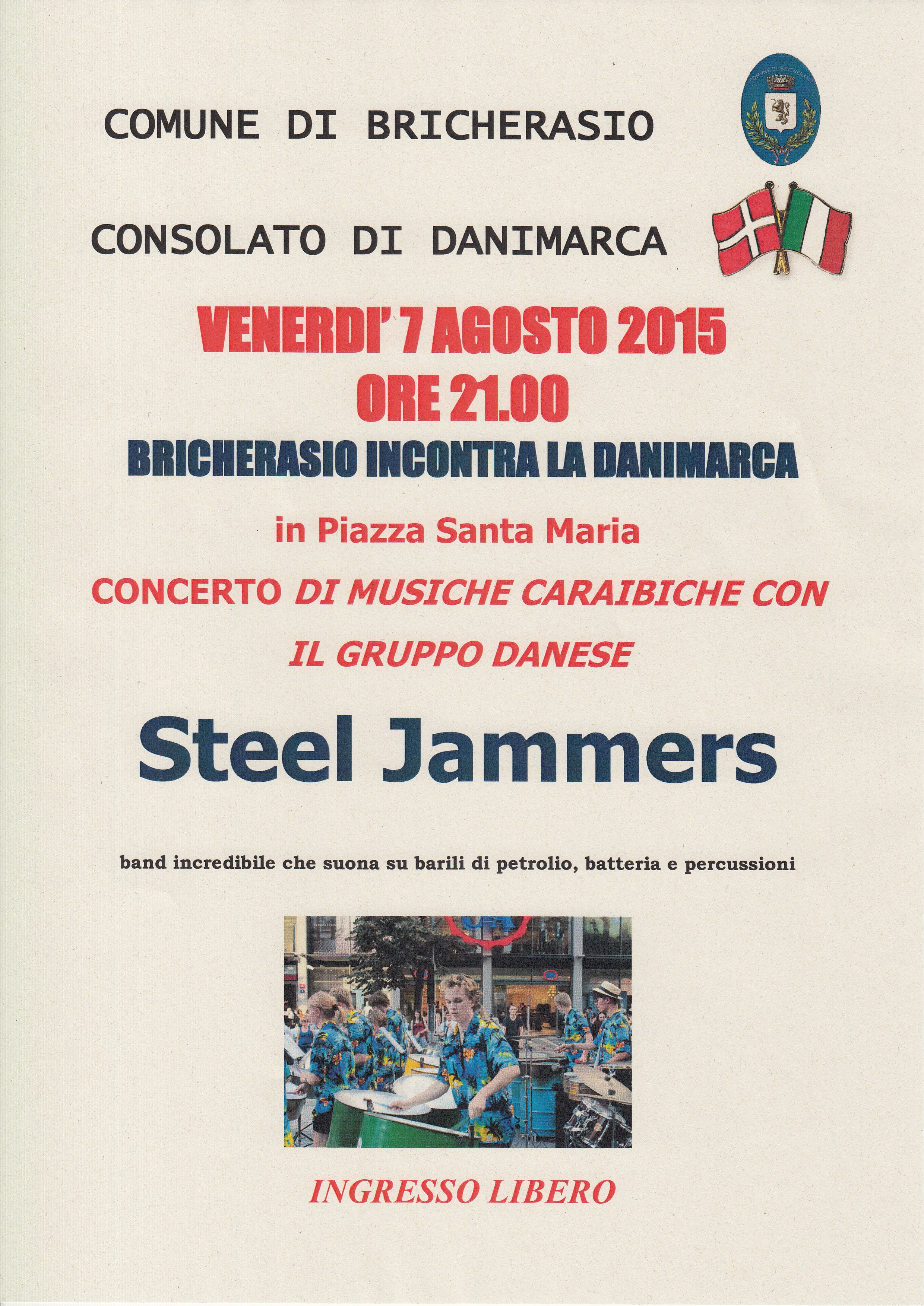 Dopo qualche anno tornano a Bricherasio, direttamente dalla Danimarca, gli Steel Jammers, una band giovane assolutamente incredibile che suona musica caraibica su barili di petrolio, batterie e percussioni (guardateli all'opera sul sito www.steeljammers.dk). L'appuntamento è per venerdì 7 agosto, alle ore 21.00, sul sagrato di Piazza Santa Maria (ingresso libero). Lo spettacolo rientra fra le manifestazioni dell’estate organizzate dal Comune di Bricherasio e si svolge in collaborazione con il Dott. Federico Daneo, Console Onorario di Danimarca, che ripercorre le orme del padre, che per vari anni ha proposto l'esibizione di gruppi danesi a Bricherasio nel corso delle rispettive tournee in Italia. Il gruppo suona calypso, samba e propone, oltre a pezzi propri, tutto il repertorio della musica caraibica che spazia da “Guantanamera” a “Oye como va“.