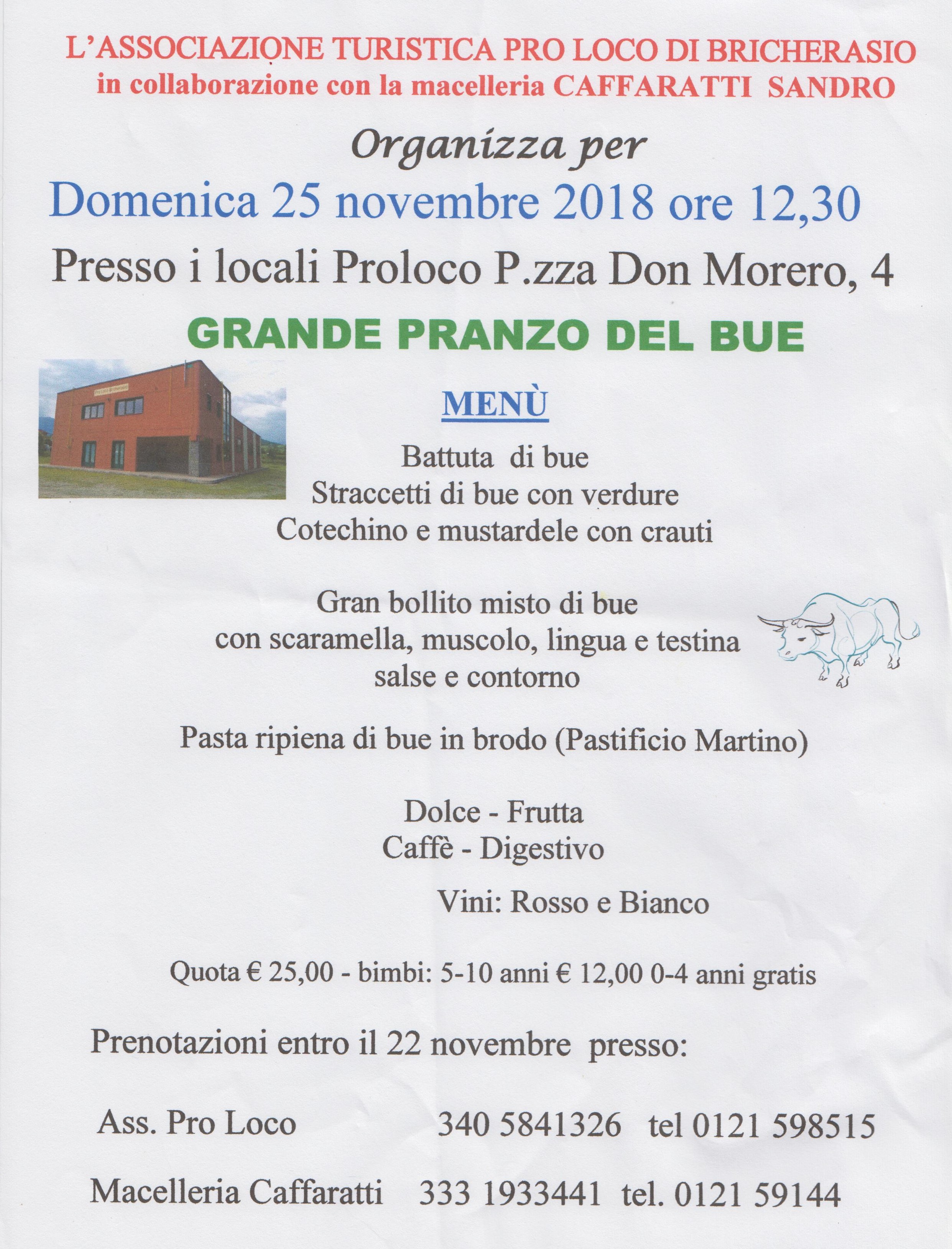 L’Associazione Turistica Pro Loco di Bricherasio in collaborazione con la Macelleria Sandro Caffaratti organizza per Domenica 25 novembre alle ore 12.30 nei locali della sede dell’Associazione Bricherasiese in Piazza Don Vittorio Morero, 4 di fianco al Salone Polivalente comunale, la diciasettesima edizione del classico convivio del bue che pure quest’anno è confermato come grande pranzo. La quota di partecipazione per gli adulti è di € 25 mentre per i bimbi dai 5 ai 10 anni è di € 12. Per informazioni e prenotazioni entro giovedì 22 rivolgersi all’Associazione Pro Loco al numero 340/5841326 oppure alla Macelleria Caffaratti allo 0121/59144.