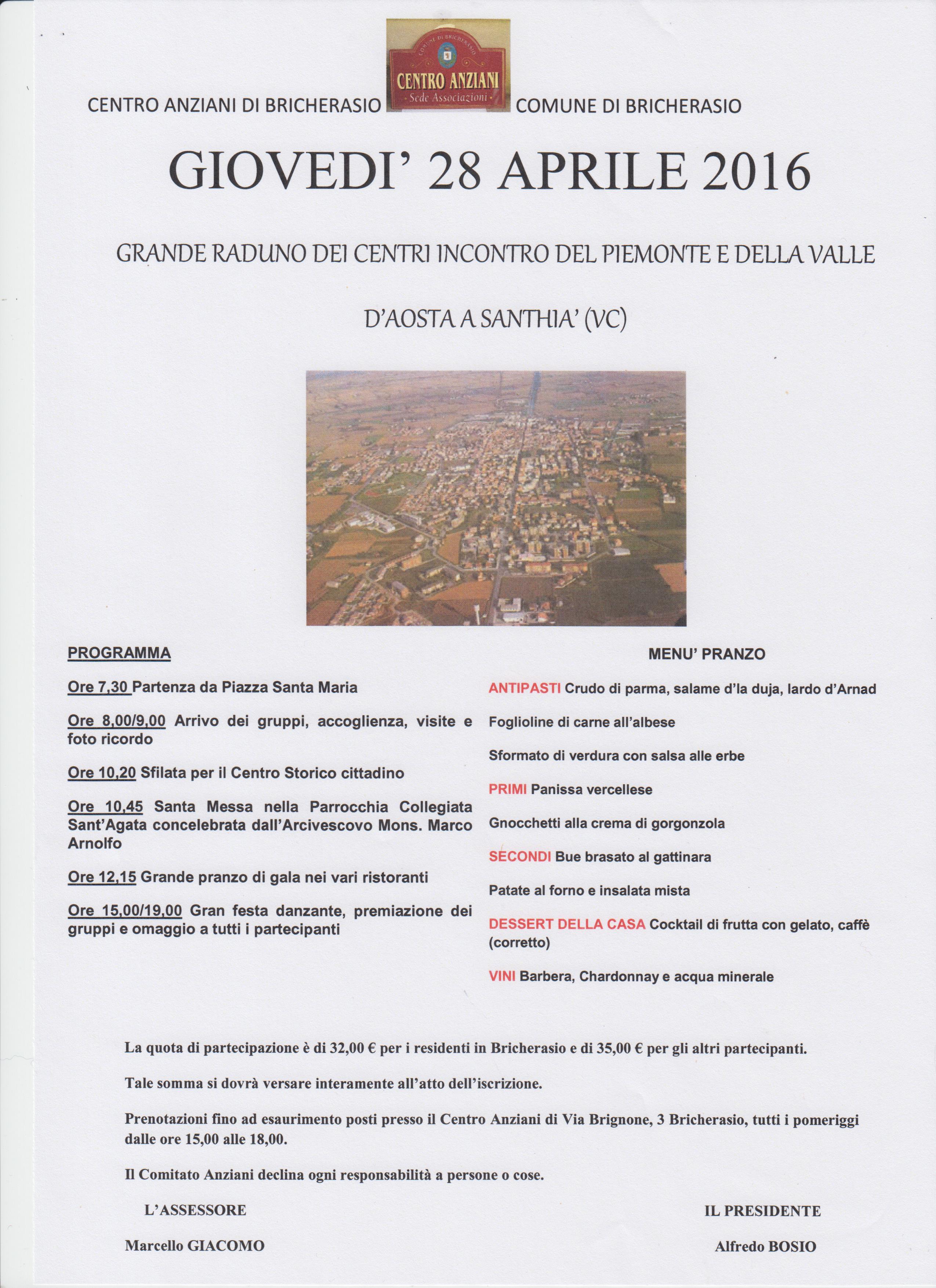 Il Centro Anziani di Bricherasio organizza, in occasione del grande raduno regionale dei Centri d’incontro del Piemonte e della Val d’Aosta, una gita a Santhià per giovedì 28 aprile. Il programma prevede la partenza da Piazza Santa Maria a Bricherasio alle ore 7,00 con arrivo ed accoglienza dei partecipanti dalle 8,00 alle 9,00 per visita alla città e foto ricordo. Segue la sfilata per le via del Centro Storico e la Santa Messa nella Parrocchia Collegiata Sant’Agata concelebrata dall’Arcivescovo Mons. Marco Arnolfo. Alle 12,15 il grande pranzo di gala con crudo di Parma, salame d’la duja, lardo d’Arnad, foglioline di carne all’albese e sfornato di verdura con salsa alle erbe di antipasti. La panissa vercellese e gli gnocchi alla crema di gorgonzola come primi piatti e bue brasato al gattinara con patate al forno e insalata mista di secondo e contorni. Chiudono il cocktail di frutta con gelato e caffè. Nel pomeriggio fino alle ore 19 festa danzante e premiazione dei gruppi con omaggio a tutti i partecipanti. Le prenotazioni si effettuano, presso il Centro Anziani di Via Brignone, 3 a Bricherasio tutti i pomeriggi dalle 15 alle 18.