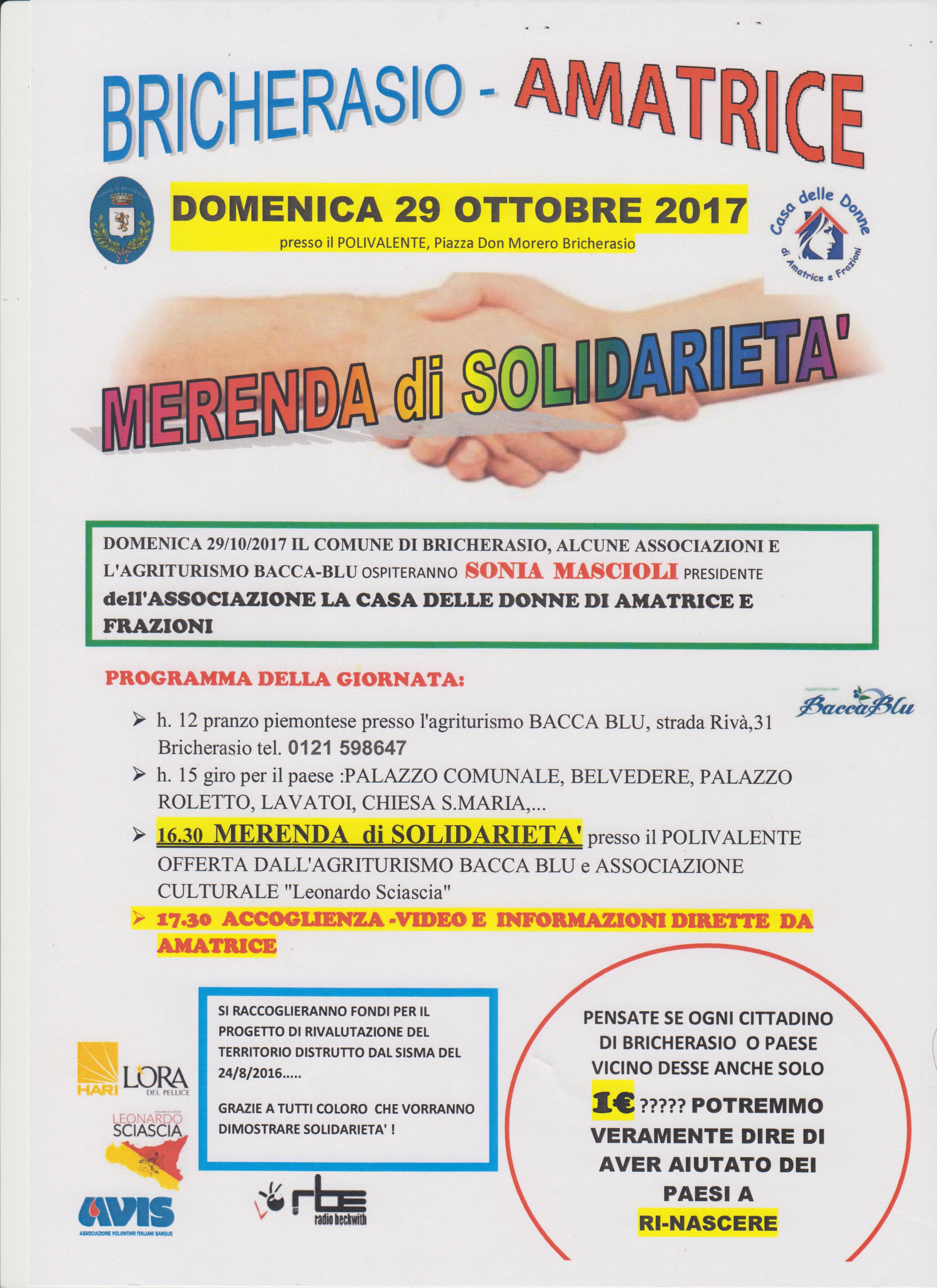 Domenica 29/10, Il Comune di Bricherasio, l’Agriturismo Bacca Blu di Bricherasio ed alcune associazioni del territorio ospitano Sonia Mascioli, Presidente dell’Associazione “Casa delle Donne di Amatrice e Frazioni” con il seguente programma: alle ore 12 pranzo piemontese all'agriturismo Bacca Blu, in Strada Rivà, 31 a Bricherasio e alle ore 15 un giro per il paese con visite al Palazzo Comunale, al Belvedere, al Palazzo Roletto e alla Chiesa Santa Maria. Alle ore 16.30 merenda di solidarietà al Salone Polivalente di Piazza Don Morero offerta dall’agriturismo Bacca Blu e dall’Associazione Culturale "Leonardo Sciascia" si chiude alle 17.30 con la visione di un video sull’accoglienza e informazioni dirette da Amatrice. Lilly di Martino, presidente della "Leonardo Sciascia", vera fautrice della lodevole e unica iniziativa concreta a favore delle popolazioni terremotate spiega il perché “A fine aprile sono stata ad Amatrice in occasione dell’inaugurazione dell’autoemoteca donata dalle sedi Avis di tutta Italia, alla quale l’Avis bricherasiese ha contribuito. Durante la visita ho parlato con la gente del posto chiedendo come aiutarli e quali erano le loro esigenze e loro mi hanno parlato della neonata Associazione “Casa delle Donne di Amatrice e Frazioni e ho subito contattato la Presidente Sonia”. Il sisma del 24 agosto, 30 ottobre 2016 e 18 gennaio 2017 sono stati di una forza distruttiva inaudita spezzando la vita di centinaia di persone ed intere famiglie senza distinzione di sorte. Si dovranno ricostruire strade, ponti, case, ma soprattutto 140 secondi sono bastati per distruggere un tessuto umano e sociale alla base della quotidianità di una piccola città come Amatrice. “Il progetto dell’Associazione Casa delle Donne di Amatrice e Frazioni, prosegue Lilly, ha l’obiettivo di creare uno spazio da dedicare alla formazione e sviluppo dell’artigianato femminile attraverso il recupero delle tradizioni. Sonia Mascioli ed il suo Direttivo rappresentano il motore dell’iniziativa intorno al quale si sono raccolte centinaia di adesioni”. L'idea del gruppo, nasce da un desiderio comune, quello di creare un luogo dove le donne di Amatrice, possano liberamente mettere in atto la loro creatività. Un vero e proprio centro dove unire, conoscenze, arte, fantasia, artigianato ed economia grazie all’allestimento di più laboratori a tema. Perché Amatrice deve ripartire anche dalle sue donne, impegnate in prima persona nel sociale e nell'economia del proprio territorio. Sempre Di Martino “I laboratori della Casa delle Donne di Amatrice e frazioni che progettano di attivare sono: 1) tessitura e coloratura con metodi naturali per la produzione di abbigliamento e arredi per la casa; 2 ) lavorazione del feltro in abbinamento alla tessitura, 3 ) ceramica e decorazione per oggettistica ed arredo casa; 4) realizzazione di bambole con abito tradizionale amatriciano, tessuto interamente a mano e cucito dalle donne della casa e ultimo per la produzione di un dolce appositamente creato per la casa delle donne ed idoneo al mercato di riferimento “Citetella”. La speranza è quella di arrivare a produrre oggetti di pregio e qualità grazie alla collaborazione di artisti di livello internazionale che si sono proposti di collaborare con la Casa delle Donne, per far conoscere Amatrice nel mondo non solo per la sua amatriciana. Ad oggi manca ancora una sede e non è facile pianificare totalmente questo multilaboratorio soprattutto sotto l’aspetto finanziario. La Presidente Mascioli afferma “In questo momento stiamo concentrando le nostre forze per riuscire a partire il prima possibile con la costruzione della nostra sede che realizzeremo grazie alla solidarietà di chi in questi mesi ci ha teso una mano”. Ancora Sonia “non siamo potute intervenire alla Sagra dell’Uva di Bricherasio, perché il 13 settembre è partito il progetto Laboratorio Amatrice che ha coinvolto in corsi di formazione sessanta persone del “cratere” progetto da noi proposto e messo in atto e finanziato dalla Regione Lazio/ARSIAL/CNA impresa sensibile che ci hanno permesso di avere docenze di rilievo e conclusosi il 13 ottobre. Il tema formativo si è concentrato sulla trasformazione agro alimentare dei prodotti del territorio”. Chiude Lilly “Vista la possibilità di formarsi attraverso i laboratori gli amatriciani ricostruiranno sicuramente il loro paese e loro non chiedono nulla ma non vogliono dimenticare. Pensate se ogni cittadino di Bricherasio e dei paesi limitrofi donasse solo 1 euro? Potremmo veramente dire di aver aiutato dei paesi a rinascere”. Per questo motivo si raccoglieranno fondi per il progetto di rivalutazione del territorio distrutto dal sisma dell’agosto 2016