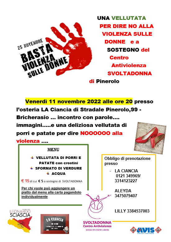 In occasione del 25 novembre, Giornata internazionale per dire no alla violenza sulle donne l’Associazione Leonardo Sciascia di Bricherasio Invita tutti alla serata di venerdì 11 novembre, alle ore 20, all’Osteria La Ciancia in Stradale Pinerolo, 99 a Bricherasio per partecipare all’incontro di parzole e immagini con uma deliziosa vellutata di porri e patate con crostini e uno sformato di verdure per dire no alla violenza pensando di organizzare qualcosa di concreto e per dare un aiuto tangibile al Centro Antiviolenza Svoltadonna di Pinerolo con una serata vellutata. Il costo di partecipazione è fissato a 15 €, di cui 5 € andranno a sostegno di Svoltadonna e per chi lo desidera si potrà aggiungere un piatto dal menù alla carta pagandolo individualmente. Obbligatoria la prenotazione alla Ciancia al numero 0121/349969, da Aleyda 347/5079407 e da Lilly al 338/4537003.