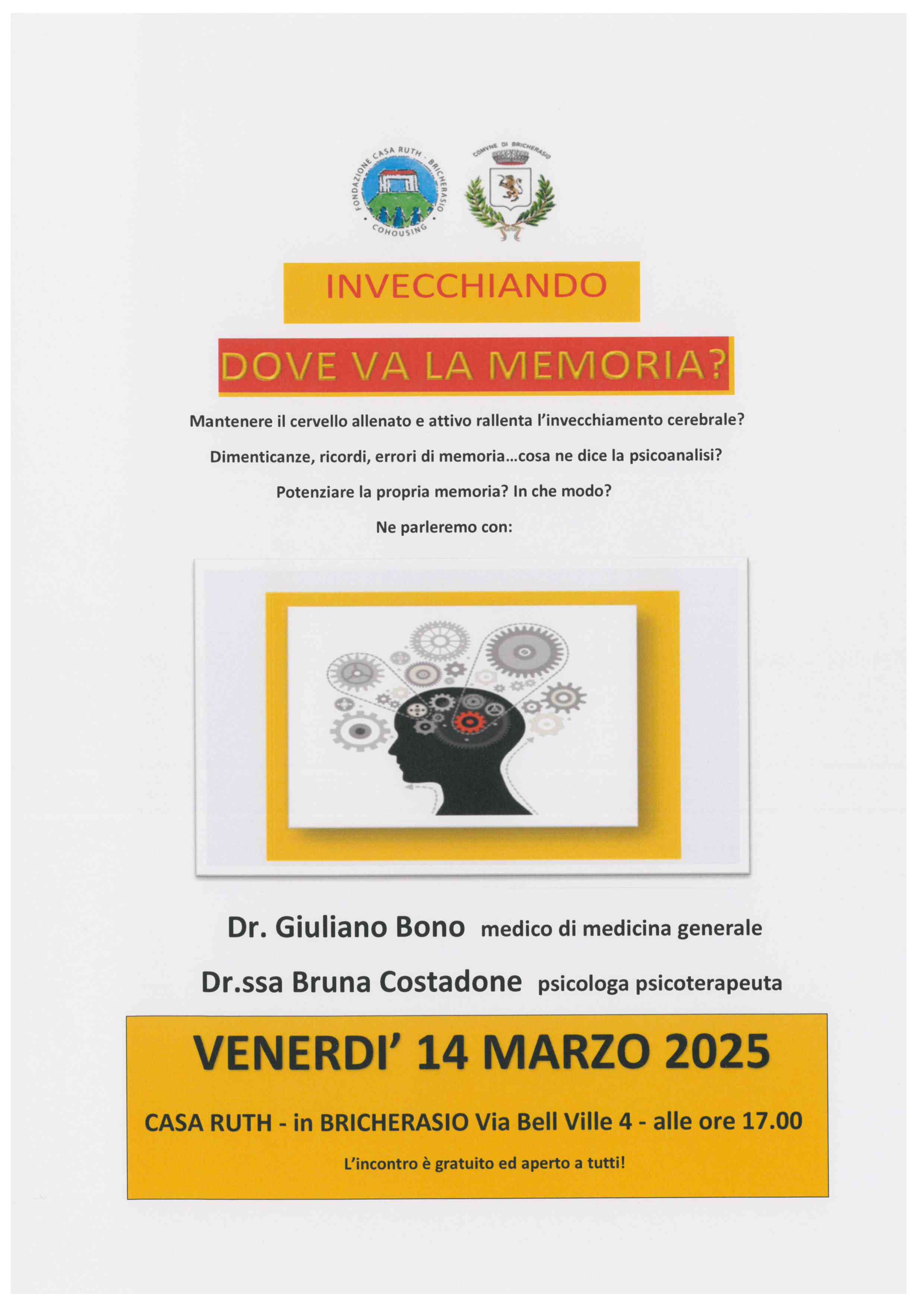 Invecchiando, dove va la memoria? è il titolo della conferenza che si svolge a Casa Ruth in Via Bell Ville, 4 a Bricherasio venerdì 14 marzo alle ore 17. Mantenere il cervello allenato e attivo rallenta l'invechiamento cerebrale? Ne parlano il medico di medicina generale Dottor Giuliano Bono e la psicologa psicoterapeuta Bruna Costadone. Ingresso gratuito