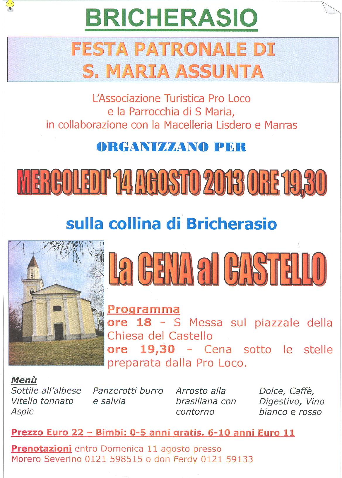L’Associazione Turistica Pro Loco di Bricherasio, in collaborazione con la Parrocchia Santa Maria, da diversi anni in occasione della festa patronale di S. Maria Assunta, organizza per mercoledì 14 agosto alle ore 19,30 una cena sulla Collina del Castello di Bricherasio. Il programma prevede alle 18,00 la Santa Messa sul prato antistante la Chiesa del Castello poi la cena sotto le stelle proposta dalla Pro Loco. Per prenotazioni, fino ad esaurimento dei posti, telefonare in Parrocchia allo 0121/59133 o Severino Morero al numero 0121/598515.