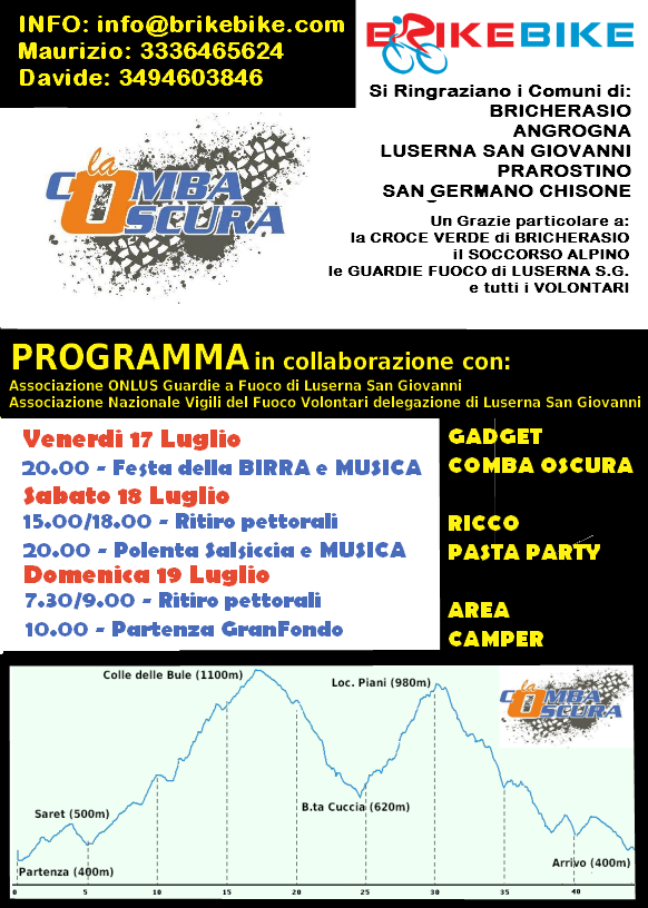 L’Associazione Brike Bike di Bricherasio organizza, in collaborazione con l’Assessorato allo Sport del Comune di Bricherasio, per Domenica 19 luglio la quinta edizione della Granfondo in mountain-bike denominata “La Comba oscura”, gara di circa 43 km con 1500 metri di dislivello ed una mediofondo di 25 km. Consolidata del calendario piemontese delle Gran Fondo, la Comba Oscura torna anche per il 2015 ad essere tappa della Coppa Piemonte MTB. La partenza, dal Centro Polivalente di Piazza Don Morero a Bricherasio, alle ore 10.00 e le iscrizioni sono aperte fino a venerdì 17 Luglio. Le iscrizioni sul posto sono possibili sabato 18 e domenica 19, fino alle ore 9.00 del mattino. La quota di iscrizione per la Gran Fondo "La Comba Oscura" è di € 27,00 fino al 17 Luglio e di € 35,00 il 18 e 19 Luglio e la quota di iscrizione comprende ristori lungo il percorso, docce, pranzo party, assistenza sanitaria, lavaggio bici e pacco gara per i primi 500 iscritti. Sono previsti sconti per team con almeno 10 atleti che si iscriveranno contemporaneamente. Per iscriversi compilare il modulo d'iscrizione allegando copia del versamento che si trova sul sito www.brikebike.com e le iscrizioni prive del pagamento non saranno prese in considerazione. Tutti i servizi pre e post gara (assistenza sanitaria, docce, lavaggio bici e pranzo party) sono dislocati nel raggio poche centinaia di metri dalla zona d'arrivo e di partenza: Salone Polivalente, Scuole Medie di Bricherasio e Campo Sportivo Comunale ed a tutti i partecipanti sarà fornito un buono pasto per il delizioso "pasta party". Per partecipare alla gara è obbligatorio indossare ed allacciare in modo corretto il casco protettivo. Già da venerdì 17 al Salone Polivalente alle ore 18,00 “La Comba fire party” organizzata dalle Guardie a Fuoco di Luserna San Giovanni e dall’Associazione Nazionale Vigili del Fuoco volontari, dalle ore 20,00 grigliata, festa della birra e musica mentre sabato 18 dalle ore 20,00 polenta, salsiccia e musica.