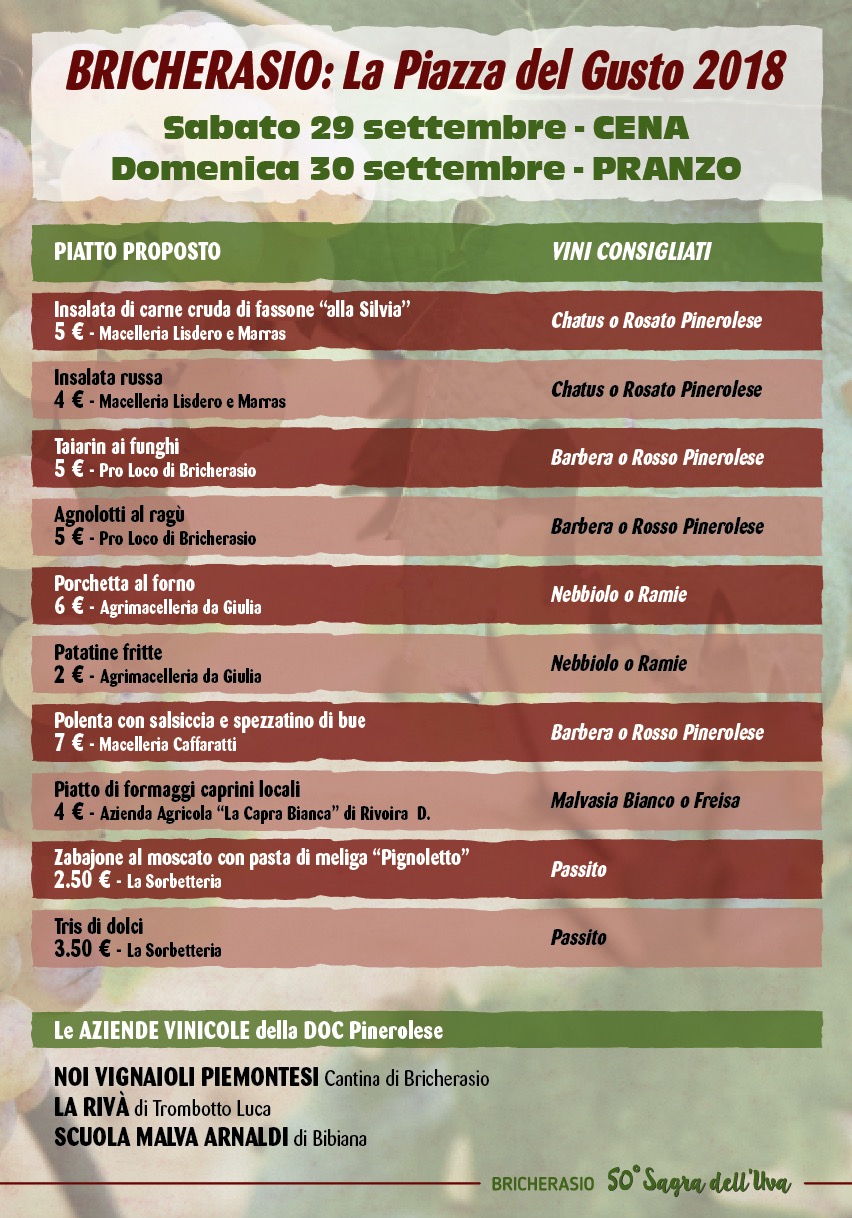 Al fine di riscoprire e potenziare il legame fra la manifestazione e il prodotto vitivinicolo il Comune ripropone, quale cuore della Sagra dell'Uva, la "Piazza del Gusto" per sabato 29 e domenica 30 settembre sotto il tendone in Piazza Castelvecchio con la possibilità di gustare a self-service i piatti della tradizione proposti dai produttori e commercianti alimentari bricherasiesi e dalla locale Pro Loco, i formaggi e i mieli della Valle. Domenica presenti anche gli stand di tutti i produttori vinicoli della DOC pinerolese con le loro migliori etichette. Ecco il menu proposto al PalaUva per l'ultimo weekend del mese.