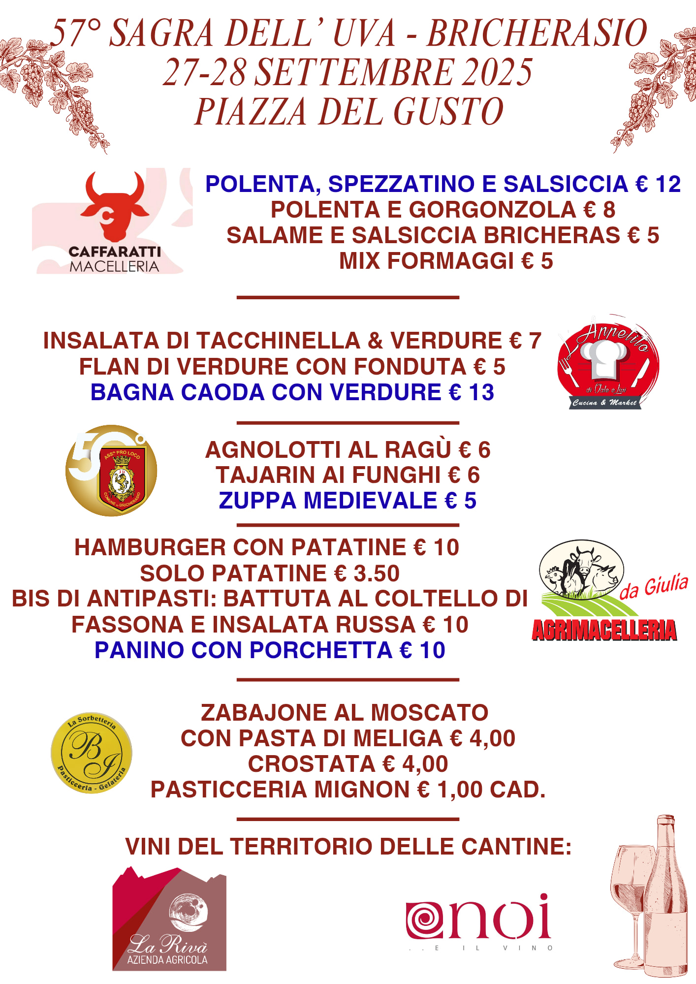 Sabato 27/9 dalle ore 19.00 e domenica 28/9 dalle ore 12.00 sotto il Pala Uva di P.za Castelvecchio riapre la Piazza del Gusto, proposta dal Comune di Bricherasio in collaborazione con la Pro Loco, i commercianti e le cantine locali.