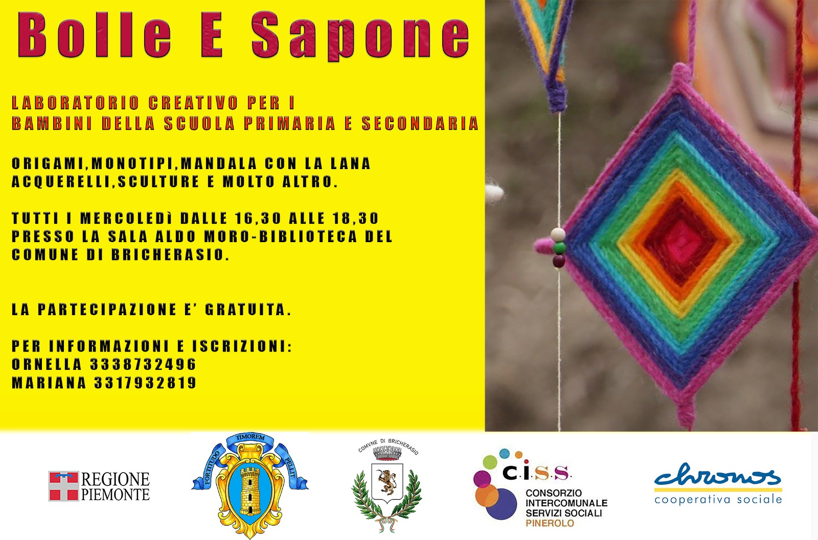 Prosegue a Bricherasio il laboratorio artistico e di manualità (origami, monotipi, mandala con la lana, acquerelli, sculture e molto altro) "Bolle e Sapone", con attività gratuite per tutti i bambini e ragazzi della scuola primaria e della scuola secondaria di 1°grado. Il progetto è svolto dalle operatrici della Cooperativa Chronos, grazie al finanziamento regionale a valenza biennale del bando "Azioni per contrasto al disagio ed alla povertà educativa", cui hanno partecipato i Comuni di Bricherasio e Torre Pellice. L'appuntamento è tutti i mercoledì dalle 16.30 alle 18.30 al Centro culturale Aldo.Moro di Via Vittorio Emanuele II, 79 a Bricherasio (sotto la scuola media).