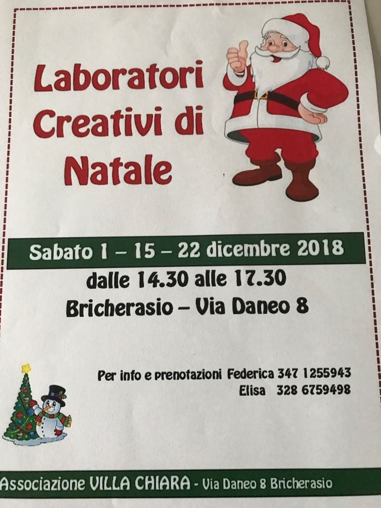 L'Associazione Villa Chiara di Bricherasio propone nel mese di dicembre tre appuntamenti per vivere la magia del Natale con i laboratori creativi dalle 14,30 alle 17,30. Ultimo incontro sabato 22 dicembre nella sede dell'Associazione in Via Daneo, 8 a Bricherasio. Maggiori informazioni da Federica al 347/1255943 oppure Elisa al 328/6759498. La manifestazione rientra negli appuntamenti della XX edizione del Natale a Bricherasio.