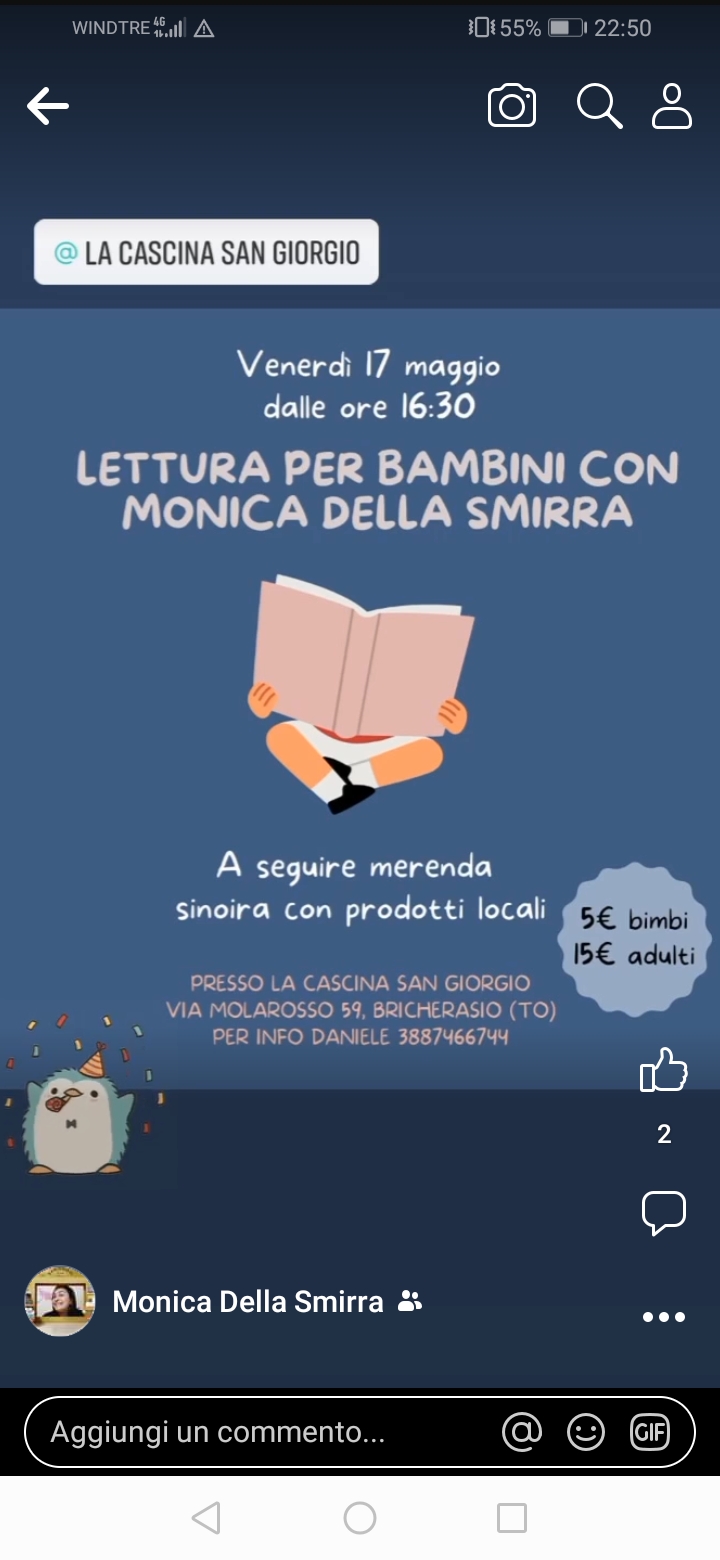 Venerdì 17 maggio alle ore 16,30 alla Cascina San Giorgio in Via Molarosso, 59 a Bricherasio si svolge una lettura per bambini con Monica Della Smirra. Al termine merenda sinoira con i prodotti locali. Il costo di partecipazione è fissato in 5 €per I bimbi e 15 € per gli adulti. . Maggiori inforrmazioni da Daniele Mourglia al numero 3887466744.