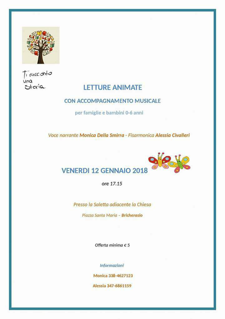 Alessia Civalleri e Monica Della Smirra propongono per venerdì 12 gennaio delle letture animate musicali ad alta voce con accompagnamento musicale per bambini fino a 6 anni, con la voce narrante di Monica e la fisarmonica di Alessia, nella Saletta adiacente la Chiesa Santa Maria a Bricherasio. L’offerta minima richiesta è di € 5. Per informazioni telefonare a Monica, 338/4627123 oppure Alessia 347/6861159.