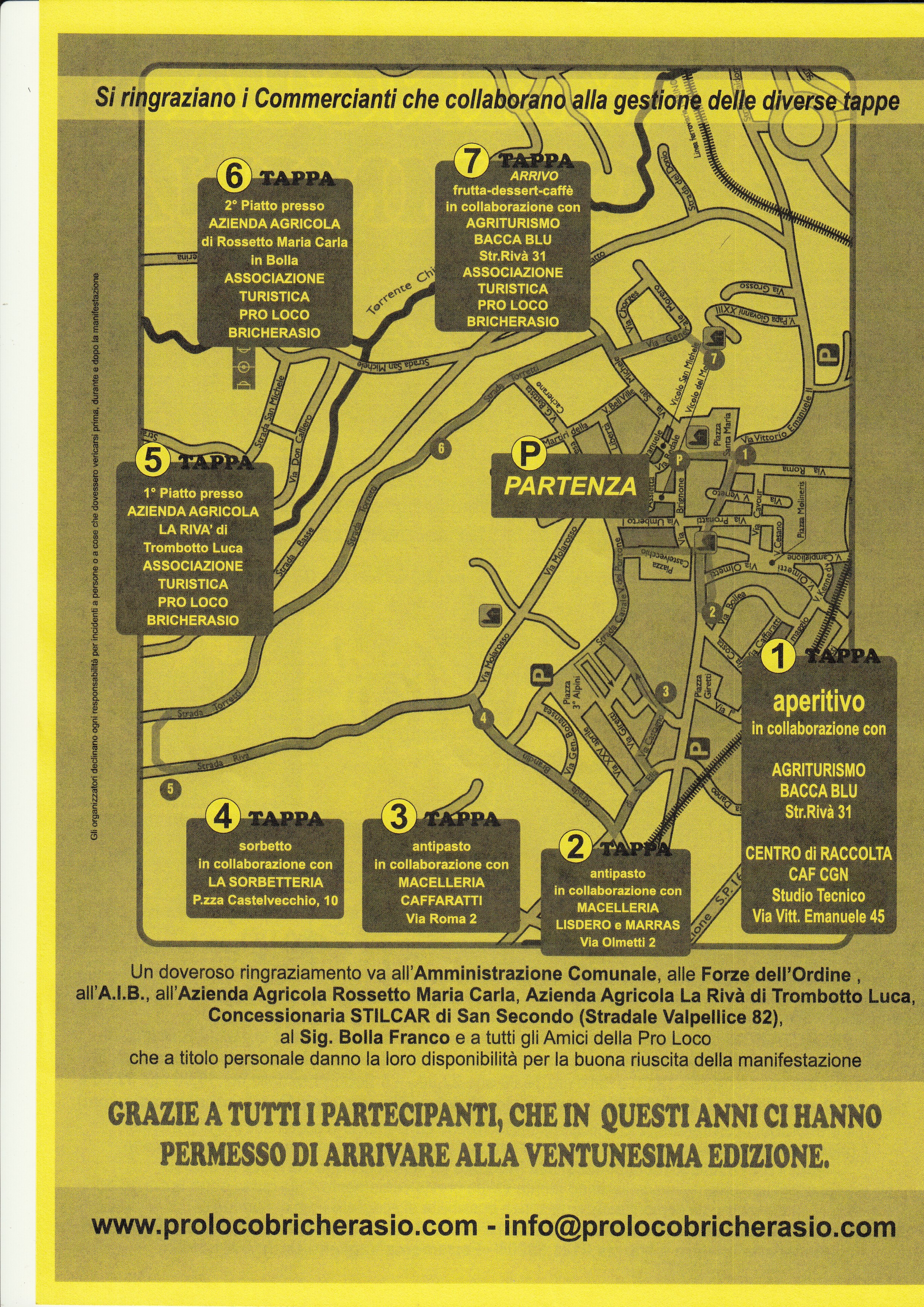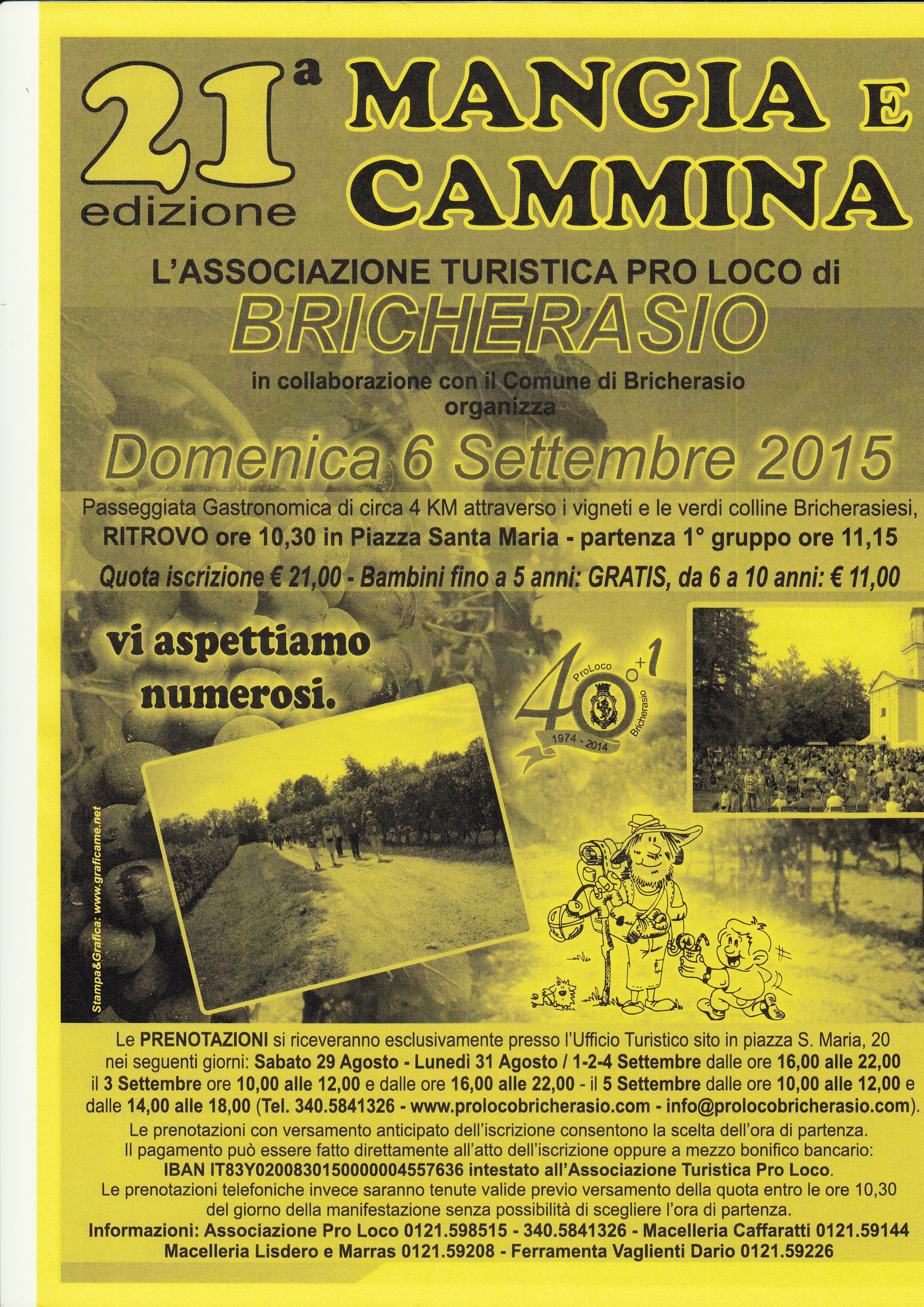 La prima Domenica di settembre appuntamento ormai classico a Bricherasio con la 21^ edizione della “Mangia e Cammina” itinerario sulle verdi colline del paese costellate di vigneti dove la musica e l'allegria faranno da cornice alla manifestazione. A Bricherasio torna per la ventunesima edizione la passeggiata eno-gastronomica di circa 4 km attraverso i vigneti e le verdi colline bricherasiesi prenderà il via alle ore 11.15 di Domenica 6 settembre con la partenza del primo gruppo. I promotori della Pro Loco, con la collaborazione del Comune di Bricherasio e dei commercianti che partecipano alla gestione delle diverse tappe, si concentrano sull’evento. La “Mangia e cammina” nasce nel 1995, quasi per scommessa. Sfruttando la posizione geografica del paese, che vede a due passi dal centro dolci colline ricoperte di vigneti colorati, si è pensato di organizzare la prima domenica di settembre questa manifestazione, per dare inizio ai festeggiamenti del settembre bricherasiese che fosse adatta alle famiglie, per far loro apprezzare i prodotti del posto, riscoprire le tradizioni contadine, il paese, e per una giornata far dimenticare le ansie e lo stress della vita quotidiana. Tutta la macchina organizzativa è operativa e le prenotazioni si ricevono presso l’Ufficio turistico in Piazza Santa Maria n. 20 nei seguenti giorni: sabato 29 agosto, lunedì 31, martedì 1 settembre, mercoledì 2 e venerdì 4 settembre dalle ore 16 alle ore 22, giovedì 3 pure la mattina dalle ore 10 alle 12 e sabato 5 dalle 10 alle 12 e dalle 14 alle 18. Ulteriori informazioni sul sito www.prolocobricherasio.com o al numero 340/5841326. Le prenotazioni con versamento anticipato dell’iscrizione consentono la scelta dell’ora di partenza. Il pagamento può essere fatto direttamente all’atto dell’iscrizione oppure tramite bonifico su IBAN IT 83 Y 02008 30150 000004557636 intestato all’Associazione Pro Turistica Pro Loco di Bricherasio.