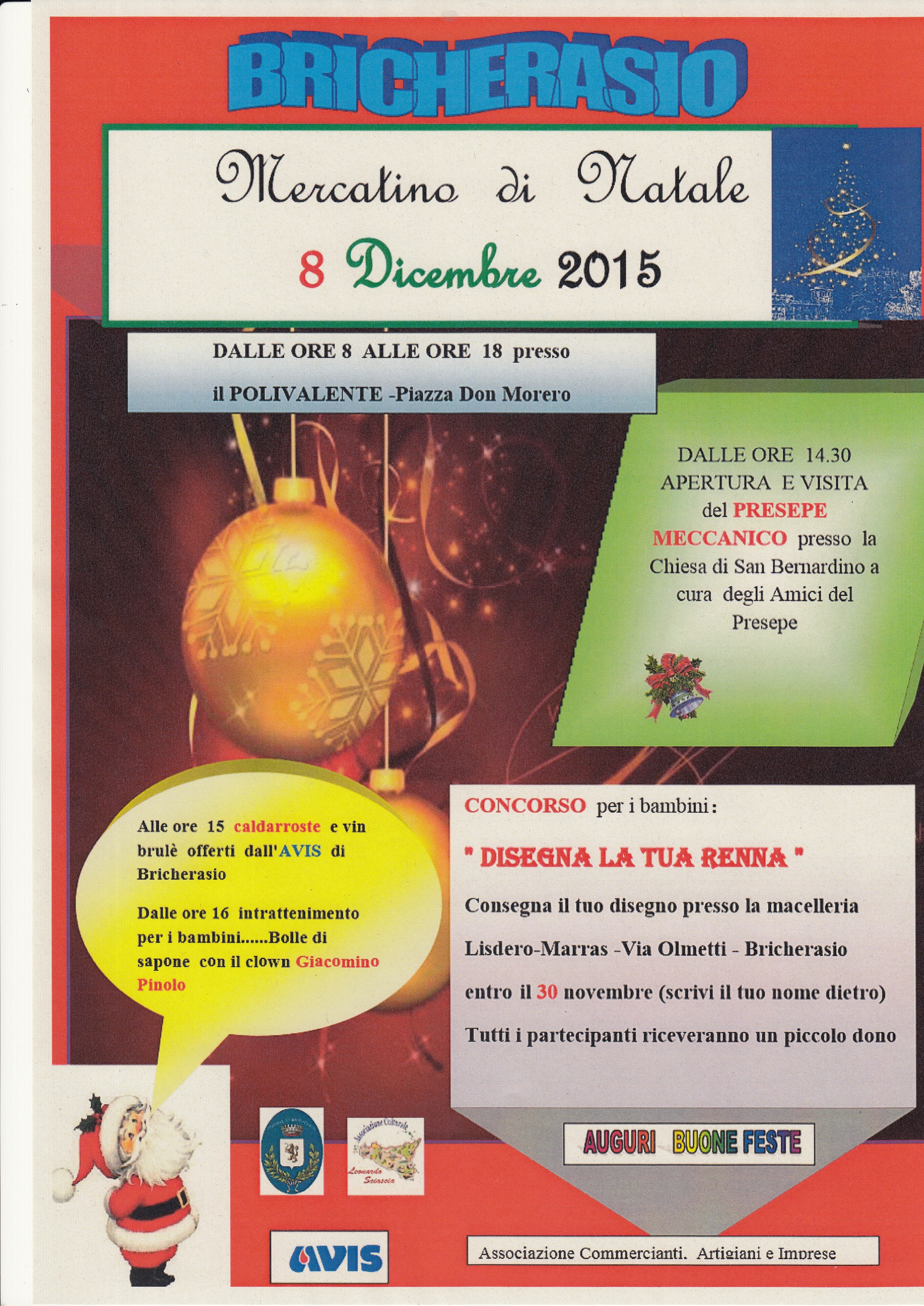 Quest'anno faremo arrivare la Magia dei MERCATINI di NATALE anche a Bricherasio seguendo la Stella del PRESEPE meccanico. Infatti l'Ass. culturale "L. Sciascia" in collaborazione con l'Ass. commercianti e l'AVIS di Bricherasio, organizza per l'8 Dicembre 2015 presso il Polivalente in occasione dell'apertura del Presepe meccanico, un mercatino di Natale.