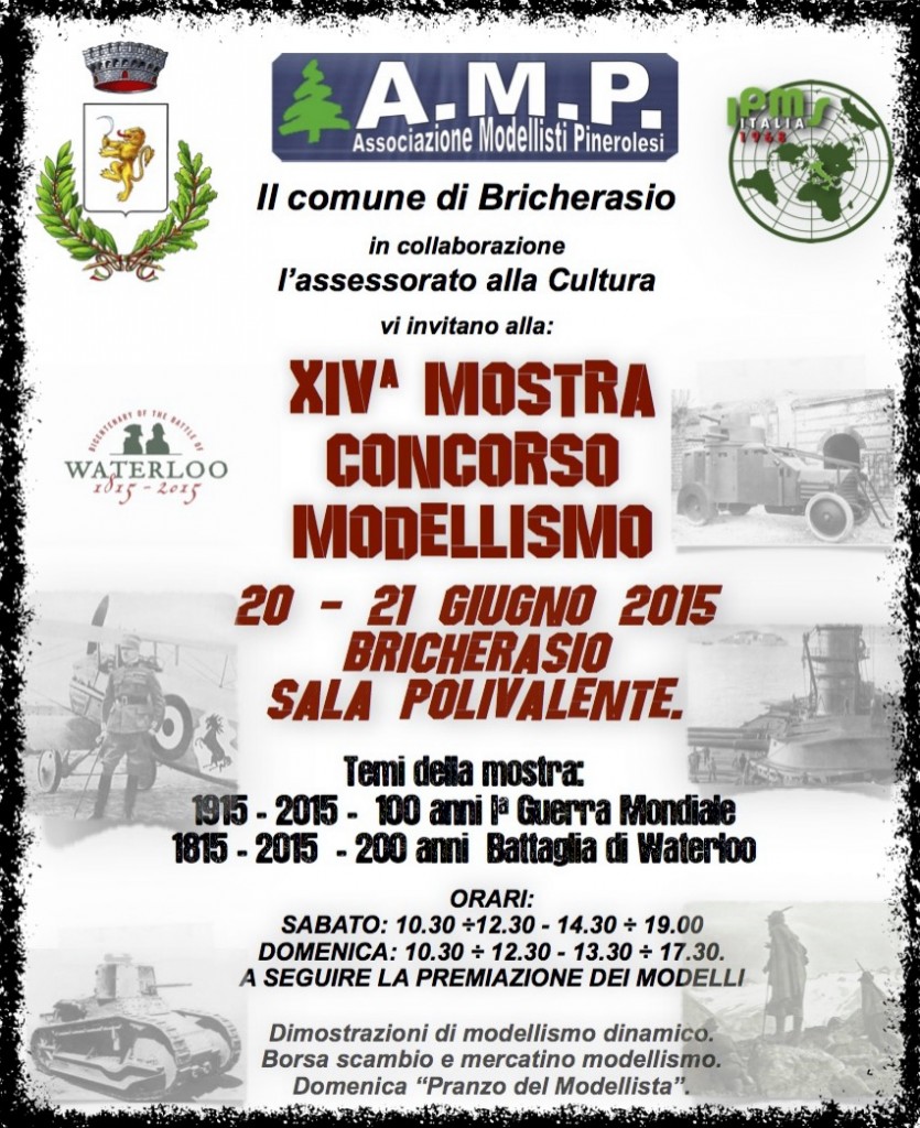L’Associazione Modellisti Pinerolese in collaborazione con l'assessorato alla Cultura del Comune di Bricherasio organizza la quattordicesima Mostra Concorso di Modellismo presso il Salone Polivalente di Piazza Don Morero per sabato 20 e domenica 21 giugno. I temi di questa edizione sono i cento anni della prima guerra mondiale e i 200 anni della battaglia di Waterloo con dimostrazioni di modellismo dinamico, borsa scambio e mercatino del modellista. La prima guerra mondiale fu il conflitto armato che coinvolse le principali potenze mondiali tra l'estate del 1914 e la fine del 1918 e prese il nome di "guerra mondiale" o anche "Grande Guerra. La battaglia di Waterloo si svolse il 18 giugno 1815 fra le truppe francesi guidate da Napoleone Bonaparte e gli eserciti britannico e prussiano. Fu una delle più combattute e sanguinose battaglie delle guerre napoleoniche, nonché l'ultima battaglia di Napoleone, segnando la sua definitiva sconfitta con il conseguente esilio a Sant'Elena. Il Salone Polivalente ospiterà un percorso che ripercorrerà le tappe salienti di questi eventi storici tramite l'ausilio di cartelloni, illustranti le fasi salienti delle due battaglie, e con una nutrita raccolta di uniformi e cimeli storici, che permetteranno di "toccare con mano" la Storia, alcune vetrine mostreranno poi momenti della battaglia "in miniatura", attraverso numerosi modelli, opera di appassionati provenienti da tutta Italia. Nata nel 1999, per iniziativa di un gruppo di modellisti pinerolesi, l’Associazione Modellisti Pinerolesi è apolitica, aconfessionale e priva di fini di lucro. Cerimonia di inaugurazione della rassegna alle ore 16 di sabato e dimostrazioni di modellismo navale, elicotteri, automobili fino alle 19. La domenica mattina si riprende sempre alle ore 10.30 prima del pranzo organizzato in collaborazione con l’Associazione Commercianti di Bricherasio e della premiazione prevista alle ore 17.30. L’ingresso alla manifestazione è gratuito.