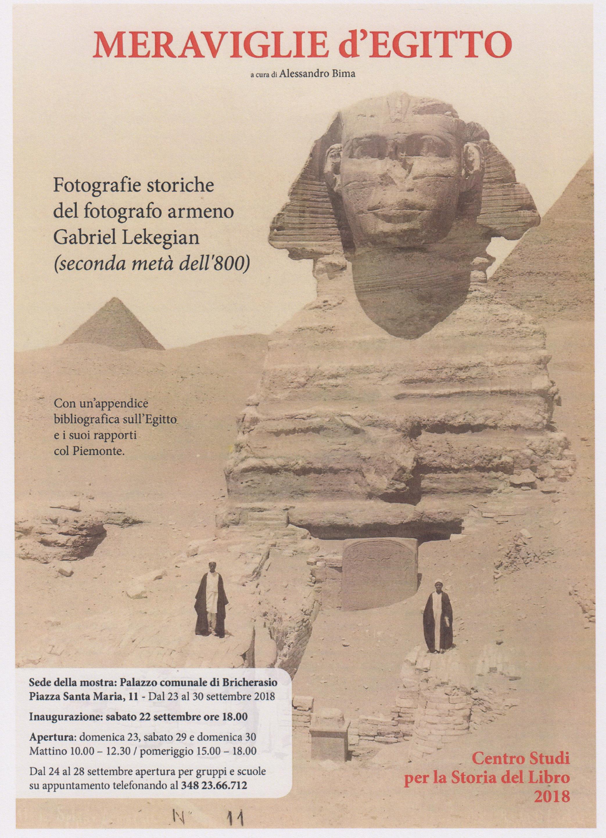 La Pro Loco di Bricherasio presenta la mostra "Meraviglie d'Egitto" con fotografie storiche del fotografo armeno Gabriel Lekegian con un'appendice bibliografica sull'Egitto e i suoi rapporti con il Piemonte a cura di Alessandro Bima. La mostra si svolge nel Palazzo comunale di Bricherasio e rientra nei festeggiamenti della 50^ Sagra dell'Uva con inaugurazione alle ore 18 di sabato 22 settembre. L'apertura è prevista Domenica 23, sabato 29 e Domenica 30 la mattina dalle 10 alle 12,30 e il pomeriggio dalle ore 15 alle 18. I gruppi e le scuole possono visitare la mostra in altri giorni prenotando l'appuntamento al numero 348-2366712.