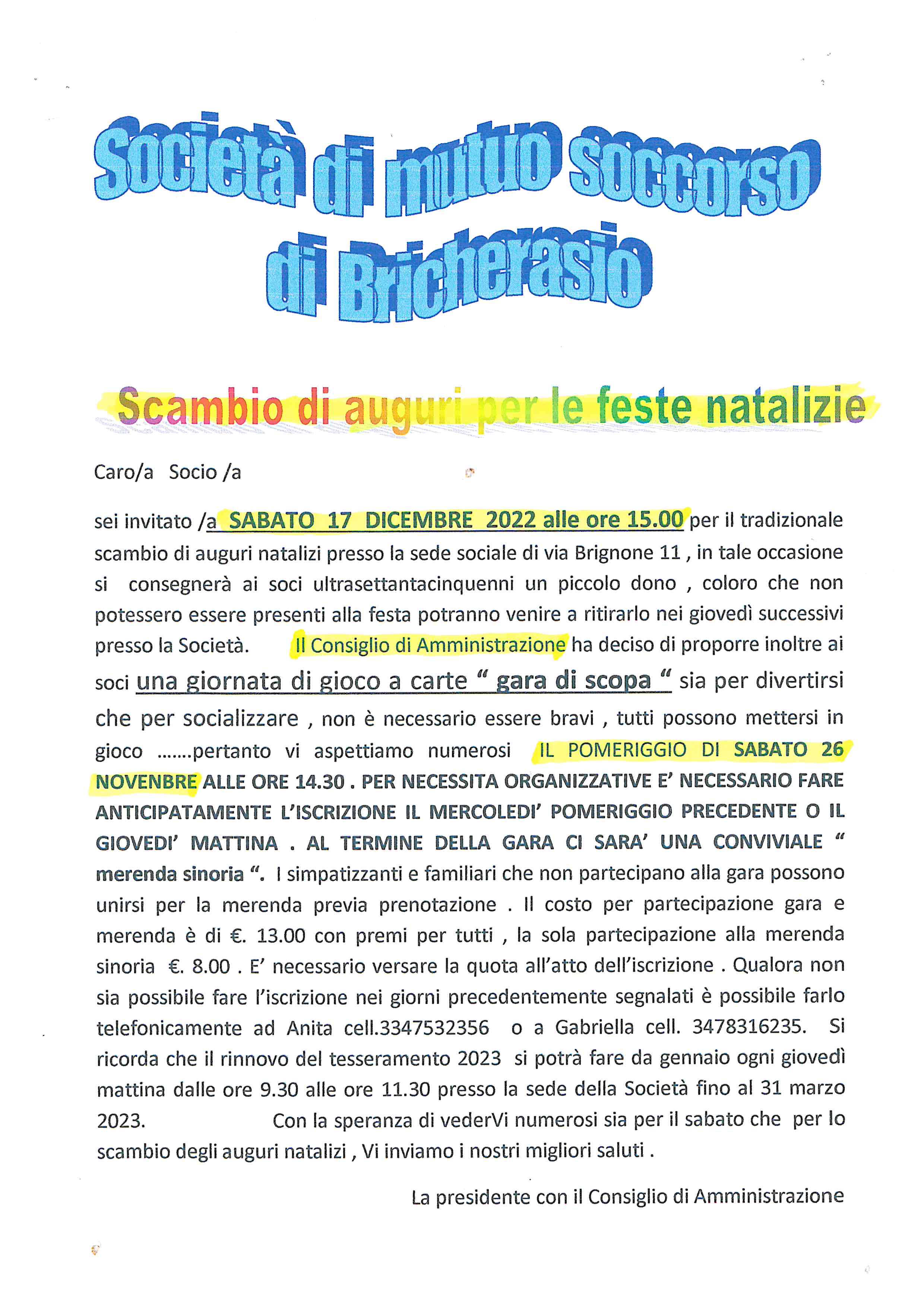Il Consiglio di Amministrazione della Società di Mutuo Soccorso di Bricherasio propone ai propri soci per sabato 17 dicembre alle ore 15 il tradizionale scambio di auguri nella propria sede sociale di Via Brignone, 11 con la consegna ai soci ultra settantacinquenni di un piccolo dono. Infine si anticipa che il rinnovo del tesseramento del 2023 si potrà effettuare dal mese di gennaio fino alla fine di marzo ogni giovedì mattina dalle 9,30 alle 11,30 in sede.