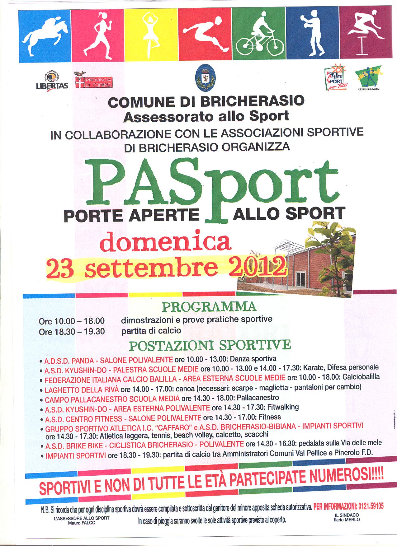 L’Assessorato allo Sport del Comune di Bricherasio organizza, con la collaborazione della Provincia di Torino e delle Associazioni Sportive del paese, per Domenica 23 settembre a partire dalle ore 10 "PASport- Porte Aperte allo Sport ", la kermesse di promozione della pratica sportiva che si propone di avvicinare i cittadini di ogni età a una salutare attività fisica, attraverso la messa a disposizione da parte del Comune dei propri impianti sportivi e da parte delle associazioni sportive di propri operatori qualificati per la dimostrazione, conduzione ed assistenza delle attività proposte. Il tutto avviene in forma gratuita. Dieci le postazioni previste a Bricherasio e sono: il Salone Polivalente per la Danza Sportiva con l’Associazione “Panda”; la palestra delle Scuole Medie con il karate e la Difesa Personale con il maestro Gianlivio Rodolfi dell’Associazione Kyushin-do e all’esterno si prova il Calciobalilla. Queste attività iniziano la mattina alle 10. Il pomeriggio alle 14 al laghetto della Rivà con la canoa dove è necessario portarsi un ricambio di maglia, pantaloncini e scarpe, al campo esterno di basket delle Scuole Medie si gioca a pallacanestro dalle 14,30. Alla stessa ora nell’area esterna del Salone Polivalente partenza del fitwalking e all’interno del Palazzetto si effettua il fitness con l’A.S.D. Centro Fitness. Agli impianti sportivi sempre dalle 14,30 si può praticare il Calcetto, il Beach Volley il Tennis, l’Atletica Leggera e novità assoluta pure gli scacchi con l’A.S.D. Bricherasio-Bibiana e il Gruppo Sportivo Atletica dell’Istituto “Caffaro”. Dal Salone Polivalente partenza della pedalata sulla Via delle mele a cura dell’A.S.D. Brike Bike alle 14,30 e alle 18,30 la manifestazione si conclude agli impianti sportivi “Guido Calleri di Sala” con un incontro di calcio tra amministratori della Val Pellice e Pinerolo F.D. Solidalmente è il nome dato alla partita il cui ricavato sarà devoluto al Pinerolo F.D.