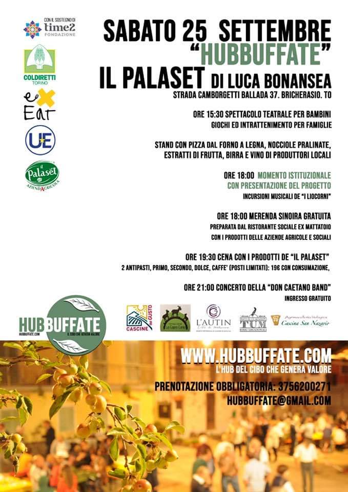 L'azienda agricola Il Palaset di Luca Bonansea di Strada Camborgetti Ballada, 37 a Bricherasio organizza per sabato 25 settembre un pomeriggio e una serata in cascina con il seguente programma. Alle ore 15,30 inizio con lo spettacolo teatrale per bambini e giochi di intrattenimento e lo stand con pizze del forno a legna, nocciole dolci e salate, estratti di frutta, birra e vino di produttori locali. Dalle 18 momento istituzionale di presentazione del progetto Hubbuffate con le incursioni musicali de “i Liocorni” d merenda sinoira gratuita preparata dal ristorante sociale ExMattatoio con i prodotti delle aziende agricole e sociali. Dalle 19, 30 parte la cena con i prodotti dell’azienda che preparerà un menù al costo di 19 e la sera con inizio alle 21 il concerto della Don Caetano Band. Posti limitati e prenotazioni al 375/6200271.