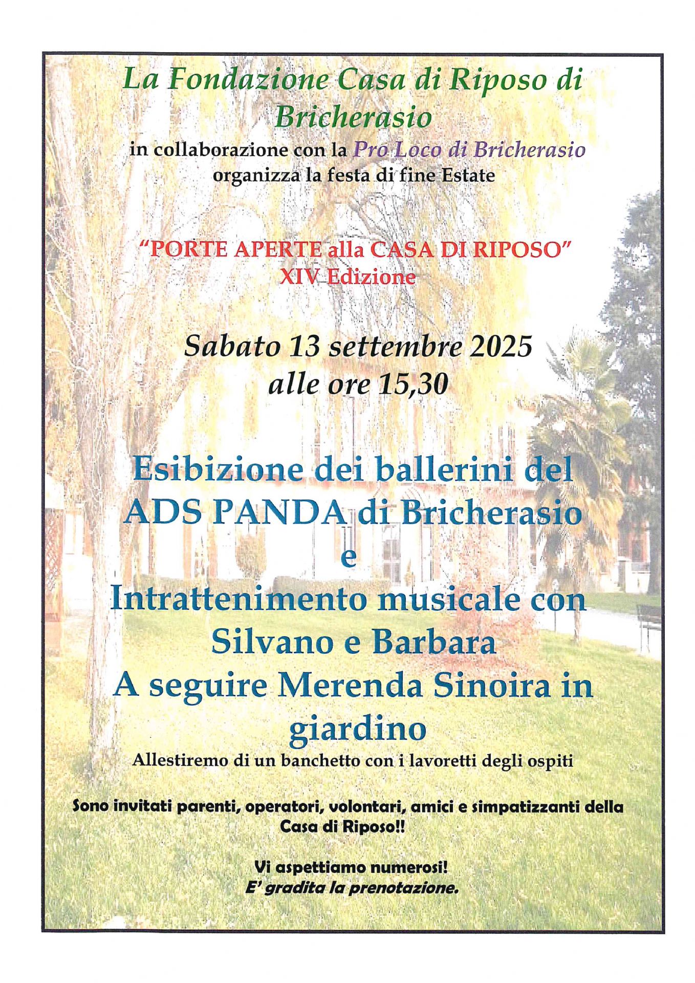 All’interno delle manifestazioni della 57^ Sagra dell’Uva ci sono le classiche ed immancabili Porte aperte alla casa di riposo di Bricherasio alle ore 15,30 di sabato 13 settembre, con animazione per allietare il soggiorno degli ospiti, parenti, volontari, amici e simpatizzanti. Arrivata alla 14^ edizione la giornata prevede un simpatico intrattenimento musicale a cura di “Silvano e Barbara” al quale farà seguito l’esibizione dei ballerini dell’Associazione Sportiva Panda nella struttura di Via Bell Ville. Gradita la prenotazione al numero 012159137.