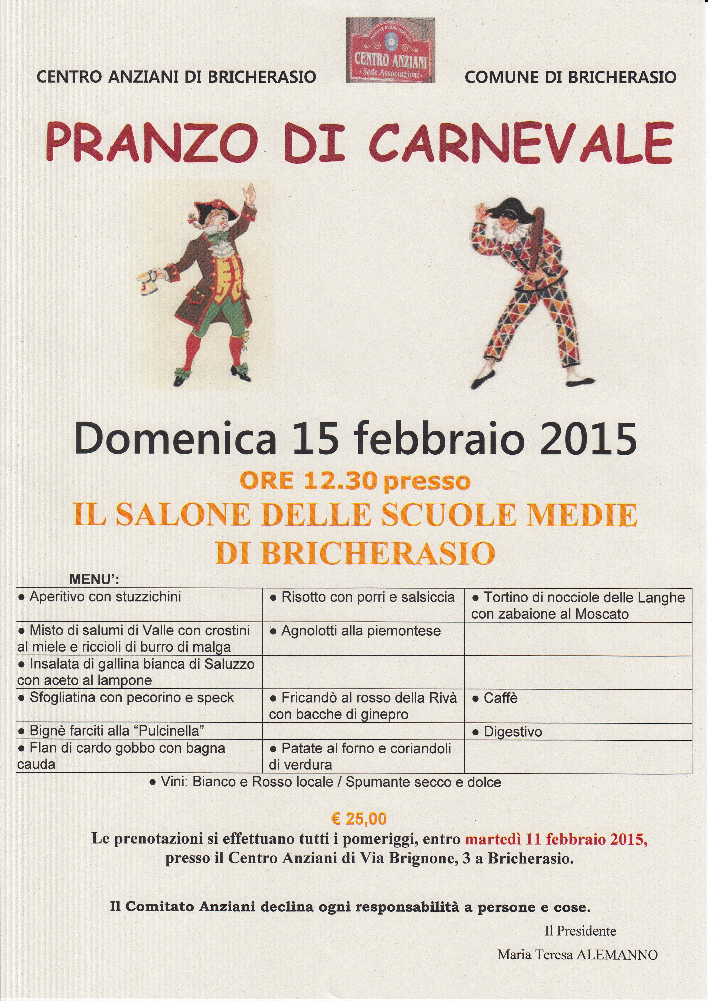 Il Centro Anziani di Bricherasio in collaborazione con il Comune organizza per Domenica 15 febbraio il consueto pranzo di carnevale e l’appuntamento quest’anno si svolge presso il salone delle scuole medie di Bricherasio. Previsto un ricco menù di prelibatezze carnevalesche a 25,00 € e per informazioni e prenotazioni rivolgersi entro martedì 11 febbraio, tutti i giorni, dalle ore 15.00 alle 18.00, presso il Centro Anziani di Via Brignone, 3 a Bricherasio.
