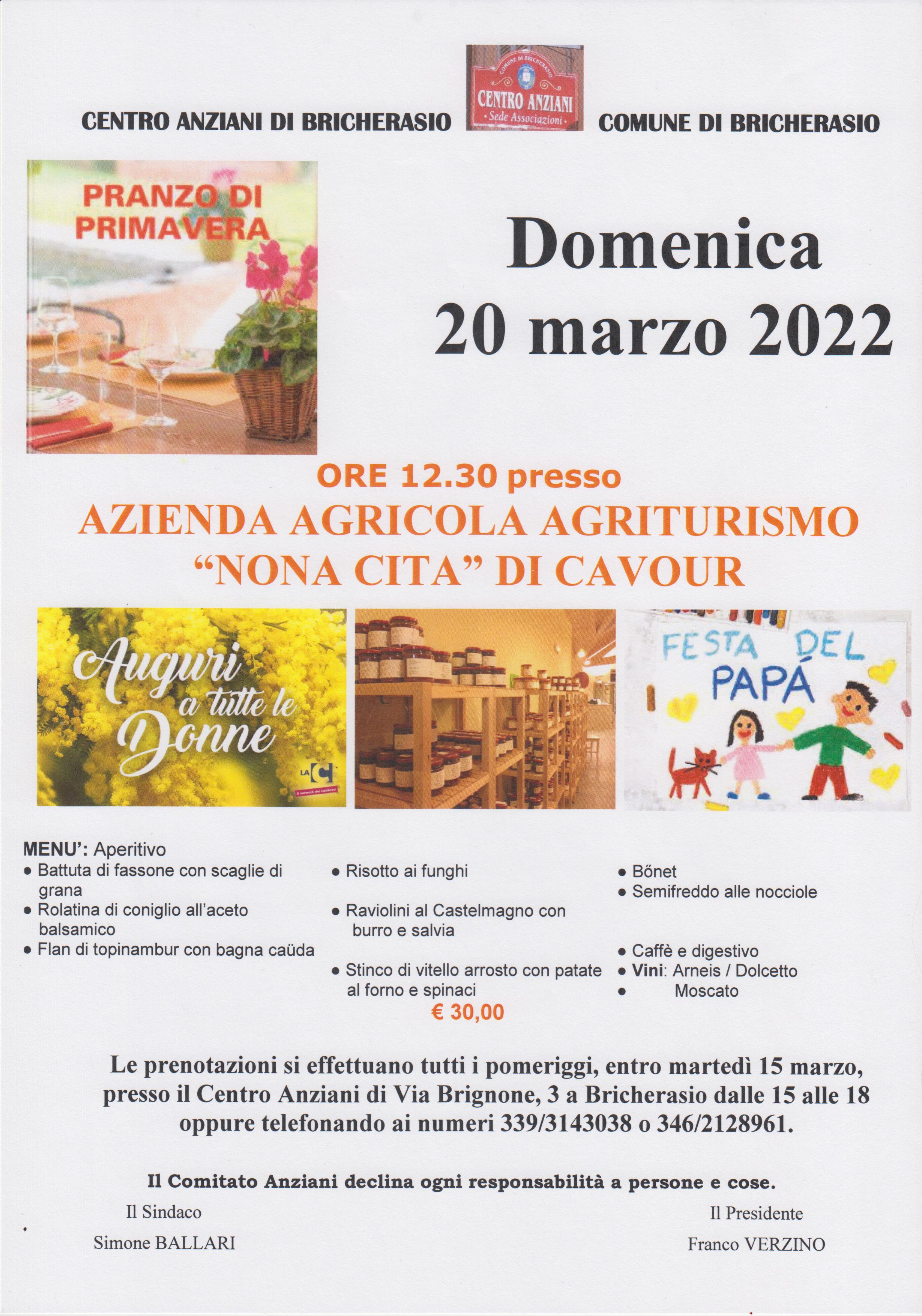Il Centro Anziani di Bricherasio comunica che per Domenica 20 marzo si prepara il pranzo di Primavera che racchiude la festa delle donne, la festa del papà e l’inizio della nuova stagione e i festeggiamenti si svolgono all’Azienda Agricola Agriturismo “Nona Cita” a Cavour con il pranzo a 30 €. Appuntamento sul posto alle ore 12,30 e le prenotazioni si effettuano tutti i pomeriggi, entro martedì 15 marzo, al Centro Anziani di Via Brignone, 3 a Bricherasio dalle 15 alle 18 oppure telefonando ai numeri 339/3143038 o 346/2128961.