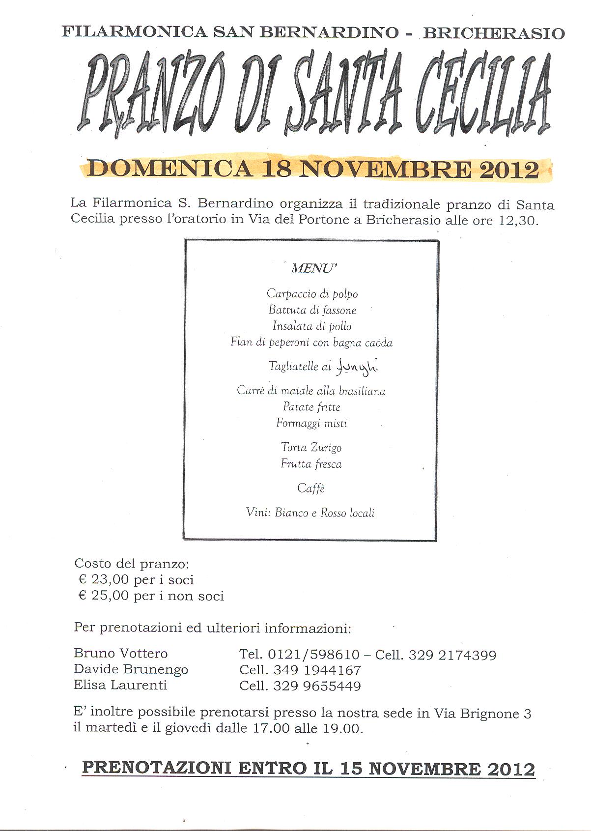 La Filarmonica San Bernardino di Bricherasio organizza per Domenica 18 novembre il tradizionale pranzo di “Santa Cecilia”, patrona della musica. Nel corso della mattinata la Banda partecipa alla Santa Messa delle ore 10,30. Come da tradizione anche quest’anno l’appuntamento si svolge alle 12,30 presso l’Oratorio Parrocchiale di Via del Portone a Bricherasio. Per informazioni e prenotazioni rivolgersi entro giovedì 15 a Bruno Vottero, 0121/598610, a Davide Brunengo al 349/1944167 oppure a Elisa Laurenti al n. 329/9655449. Inoltre è possibile prenotarsi presso la sede della banda in Via Brignone, 3 il martedì e il giovedì dalle 17 alle 19.
