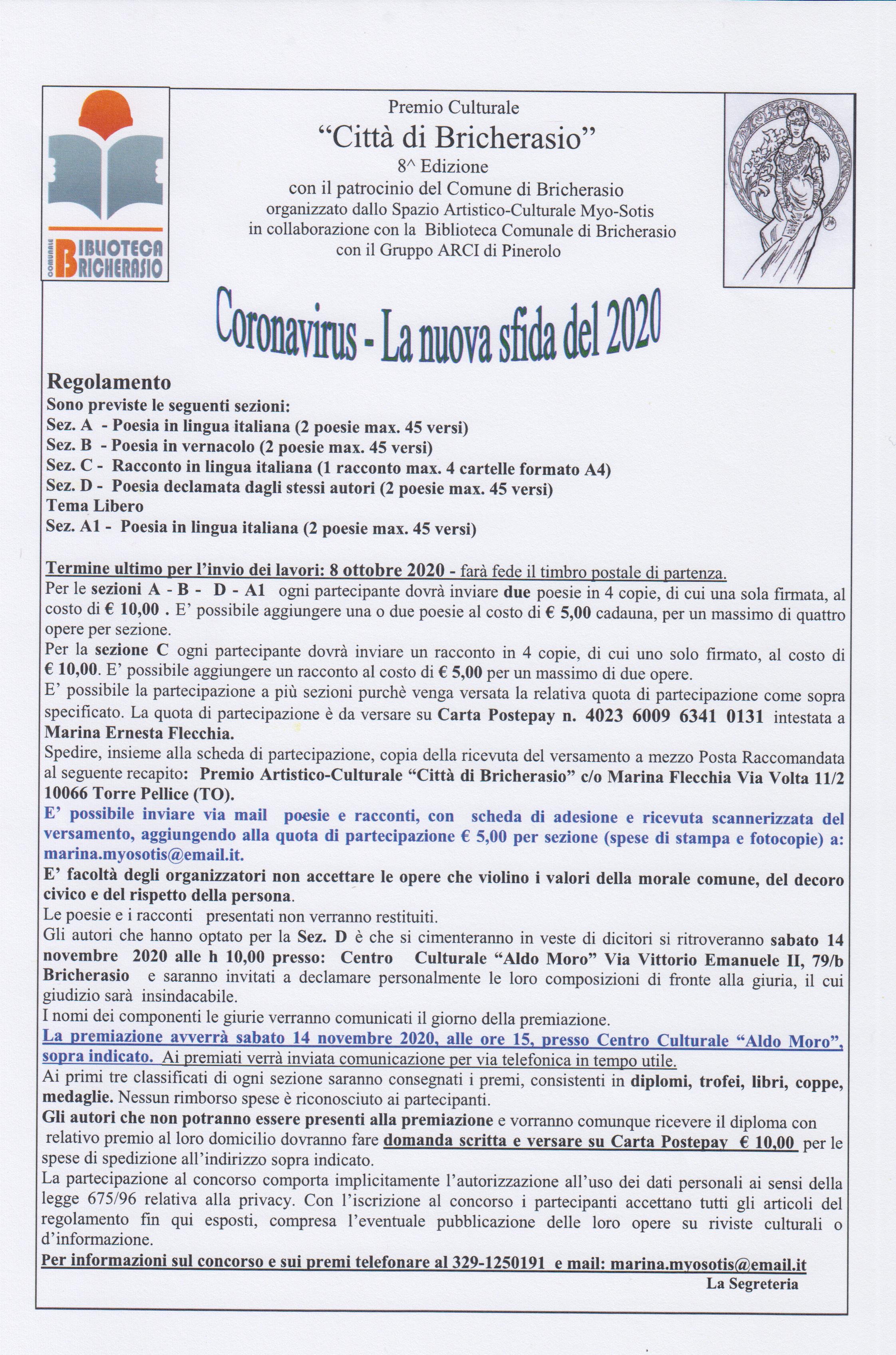Lo Spazio Artistico-Culturale Myo-Sotis in collaborazione con la Biblioteca Comunale di Bricherasio ed il Gruppo ARCI di Pinerolo con il patrocinio del Comune di Bricherasio organizzano Il Premio Culturale “Città di Bricherasio", giunto all’8^ Edizione. Il Concorso letterario a tema Coronavirus, la nuova sfida del 2020 prevede le seguenti sezioni: poesia in lingua italiana, poesia in vernacolo, racconto in lingua italiana e poesia declamata dagli stessi autori. A tema libero pure la poesia in lingua italiana. Gli autori che si cimenteranno in veste di dicitori si ritroveranno sabato 14 novembre 2020 alle ore 10 al Centro Culturale “Aldo Moro” di Via Vittorio Emanuele II, 79/b Bricherasio e saranno invitati a declamare personalmente le loro composizioni di fronte alla giuria, il cui giudizio sarà insindacabile. La premiazione avverrà sabato 14 novembre 2020, alle ore 15, al Centro Culturale “Aldo Moro”. Ai primi tre classificati di ogni sezione saranno consegnati i premi, consistenti in diplomi, trofei, libri, coppe, medaglie. Per informazioni sul concorso e sui premi telefonare a Marina Flecchia al numero 329-1250191 oppure scrivere all’email: marina.myosotis@email.it