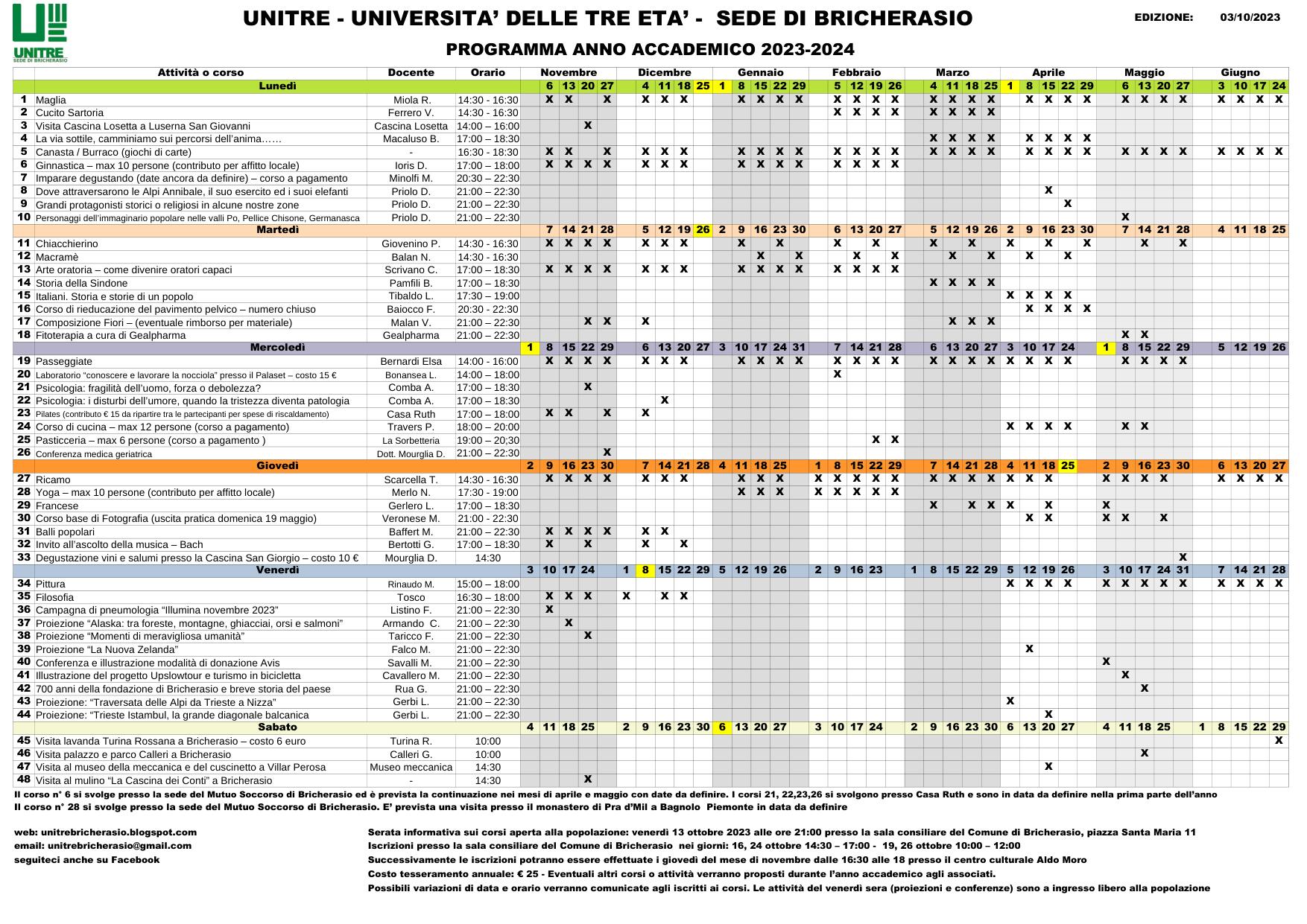 La presentazione dei corsi dell'anno accademico 2023/2024 dell’Unitre di Bricherasio è prevista per venerdì 13 ottobre alle ore 21.00 nella sala Consiliare del Comune di Bricherasio, in Piazza Santa Maria n. 11. Le iscrizioni si effettuano nel medesimo luogo lunedì 16 e martedì 24 ottobre dalle ore 14.30 alle 17.00, giovedì 19 e giovedì 26 ottobre dalle ore 10.00 alle 12.00. Successivamente le iscrizioni potranno essere effettuate i giovedì del mese di novembre dalle 16.30 alle 18.00 presso il Centro Culturale “Aldo Moro” di Via Vittorio Emanuele II n. 79/B, dove si svolge gran parte dell’attività. Il costo del tesseramento annuale è invariato ed è pari ad € 25,00. Eventuali altri corsi o attività verranno proposti durante l’anno accademico agli associati. Le attività del venerdì sera (proiezioni e conferenze) sono ad ingresso libero alla popolazione e possibili variazioni di data e orario verranno comunicate agli iscritti ai corsi.