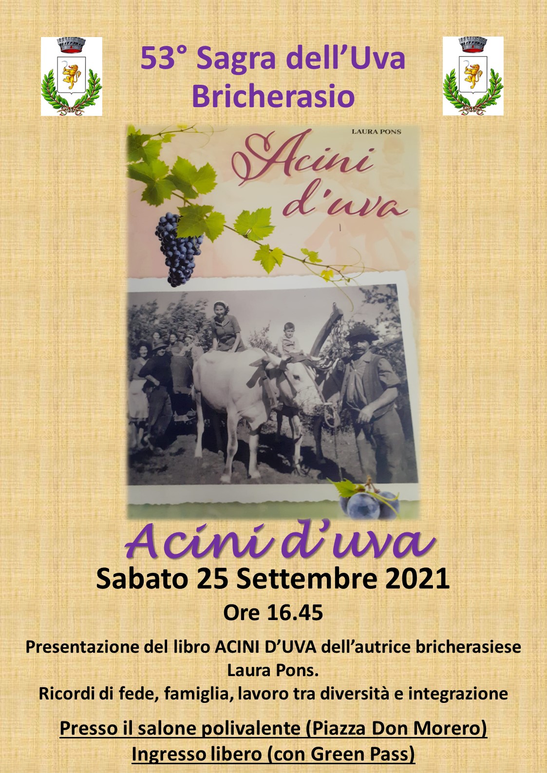 Sabato 25 alle ore 16.45 presentazione di “Acini d’uva” dell’autrice bricherasiese Laura Pons. Il libro è una testimonianza dei ricordi di quando l'autrice frequentava la scuola della frazione di Cappella Moreri, nel comune di Bricherasi,. Era l'unica allieva di religione valdese nella pluriclasse di prima, seconda e terza elementare. E nei suoi scritti traspare il desiderio, celato da una sofferenza interiore, di voler essere considerata come tutti i compagni. L’incontro si svolge al Salone Polivalente con ingresso libero e presentazione del green pass.