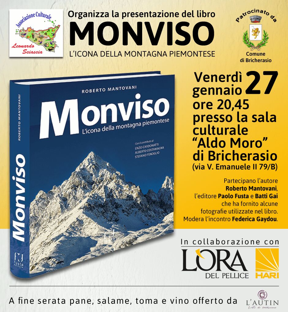 L'Associazione Leonardo Sciascia di Bricherasio organizza, in collaborazione con L'Ora del Pellice, la presentazione del libro "Monviso,icona delle montagne piemontesi" per venerdì 27 gennaio alle ore 20,45 nel salone "Aldo Moro" in Via Vittorio Emanuele II, 79/B a Bricherasio. Partecipano l'autore Roberto Mantovani, l'editore Paolo Fusta e Betti Gai che ha fornito alcune fotografie. Modera l'incontro Federica Gaydou. A fine serata pane, salame, toma e vino offerti dalla Cantina Autin di Barge.