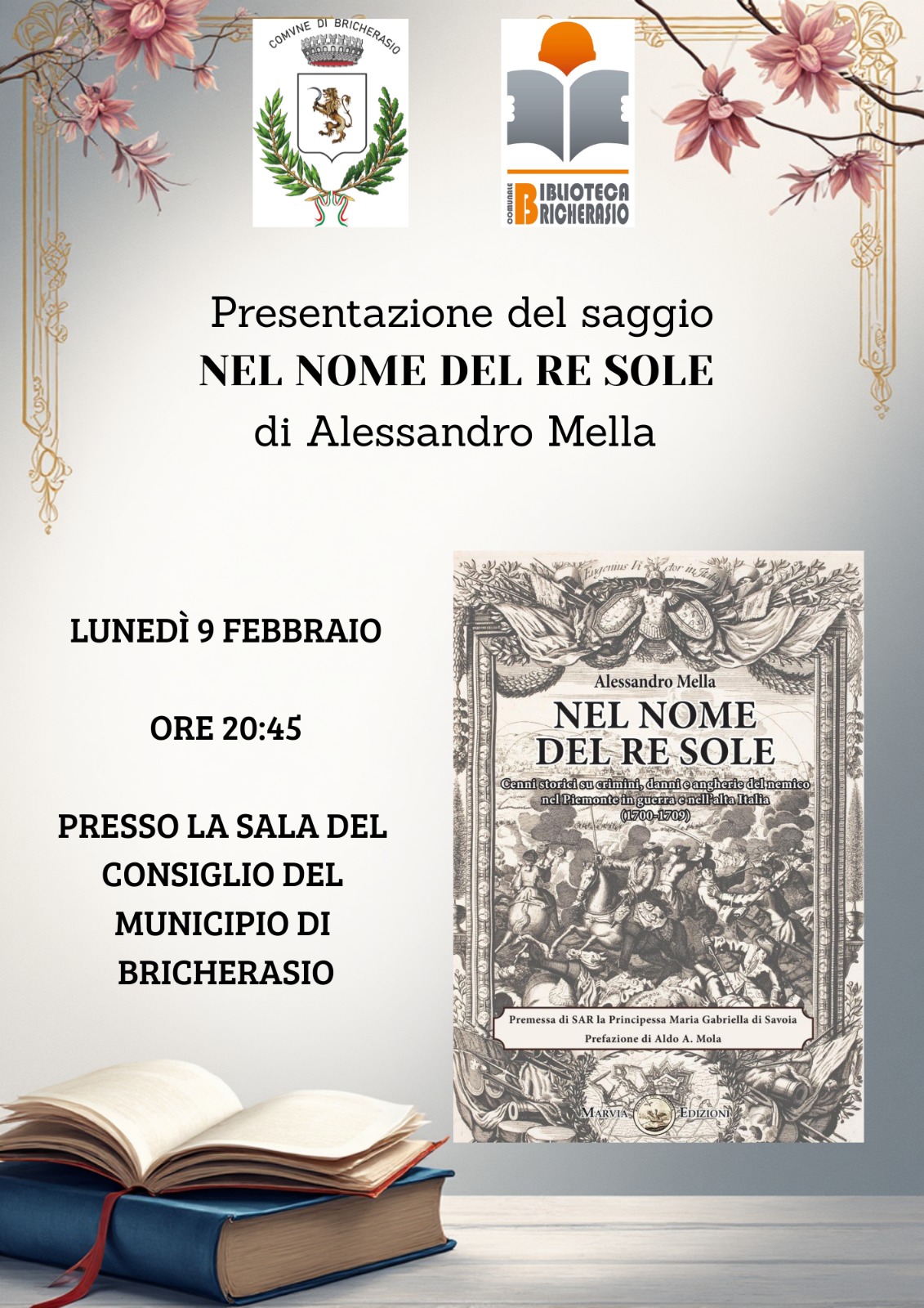 Il Comune di Bricherasio e la Biblioteca comunale aspettano gli interessati lunedì' 9 febbraio alle ore 20,45 per la presentazione del libro "Nel nome del Re Sole" scritto da Alessandro Mella, Cavaliere dell'Ordine al Merito della Repubblica Italiana, divulgatore storico e scrittore con un paragrafo del saggio dedicato a Bricherasio. Appuntamento in Sala ConsIglio del Municipio brIcherasIese.