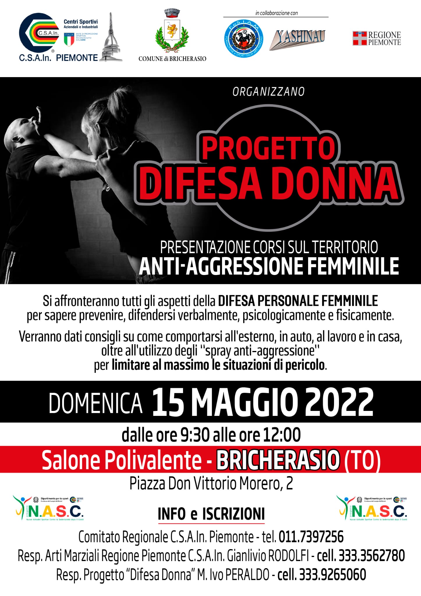 Domenica 15 maggio dalle ore 9,30 alle 12 al Salone Polivalente di Piazza Don Morero, 2 a Bricherasio il Comune, l’Asd Fesiam, la Regione e il Centro Regionale Csain Piemonte organizzano la manifestazione sportiva "Progetto Difesa Donna" con la partecipazione di tutte le Associazioni sportive che partecipano al progetto per la presentazione dei corsi sul territorio di anti aggressione femminile. Si affronteranno tutti gli aspetti della difesa personale femminile per sapere prevenire, difendersi verbalmente, psicologicamente e fisicamente e saranno dati consigli su come comportarsi all’esterno, in auto, al lavoro e in casa, con utilizzo degli spray anti-aggressione per limitare al massimo le situazioni di pericolo. La Associazione sportiva dilettantistica Fesiam avendo aderito al Progetto Difesa Donna Csain ed avendo nelle sue file il Maestro Rodolfi Gianlivio referente regionale Karate Csain Piemonte e' lieta di invitare tutti gli interessati alla manifestazione come testimonianza del lavoro che le Associazioni svolgono sul territorio, non solo d'interesse sportivo, ma anche con momenti di incontro e condivisione sociale.