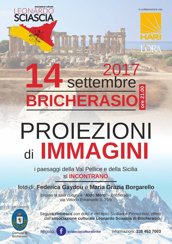 Giovedì 14 settembre alle ore 21, all'interno della 49^ Sagra dell'Uva, serata di proiezione di immagini dei paesaggi della Val Pellice e della Sicilia che si incontrano, con foto a cura di Federica Gaydou e Maria Grazia Borgarello. Appuntamento nella sala culturale Aldo Moro in Via Vittorio Emanuele II, 79/b a Bricherasio. Seguirà rinfresco con dolci e vini tipici Piemontesi e Siciliani. Evento a cura dell'associazione culturale Leonardo Sciascia di Bricherasio e con la collaborazione della associazione HARI (L'Ora del Pellice). Info: 338 453 7003
