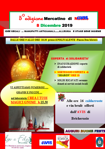 Domenica 8 dicembre la quinta edizione del Mercatino di Natale al Salone Polivalente con l’inaugurazione della “Coperta della solidarietà” proposti dall'Associazione culturale "Leonardo Sciascia" e nel corso della giornata saranno allestiti dei laboratori dove grandi e piccini potranno creare il loro magico gnomo, organizzato con la collaborazione di Ago e filo, merceria di Monica Busso mentre l'AVIS Comunale offrirà a tutti caldarroste e vin brulè. Tra le piastrelle e coperte arrivate da ogni parte d'Italia e molti paesi del nostro territorio tutte molto belle e colme di storie proprie ed emozioni sono da mettere in evidenza quelle donate da persone che vivono un disagio ma pronte alla solidarietà verso altri come le ospiti dell’Asilo Valdese di San Giovanni, una coperta dalla Casa delle Donne di Amatrice e frazioni che il 30 novembre hanno inaugurato la loro struttura polivalente e la coperta arrivata da Santa Caterina Villarmosa in provincia di Caltanissetta, paese di molte famiglie siciliane residenti da anni a Bricherasio, impegno del Comune nella figura dell'assessore alla cultura Giuseppe Natale. Con il ringraziamento che và a tutti coloro che hanno collaborato a questa bellissima ma onerosa iniziativa. Le coperte di solidarietà il 6 gennaio verranno ritirate, lavate e consegnate all'Esercito della Salvezza di Torino impegnato a far fronte alle necessità primordiali di molti dal cibo al vestiario.