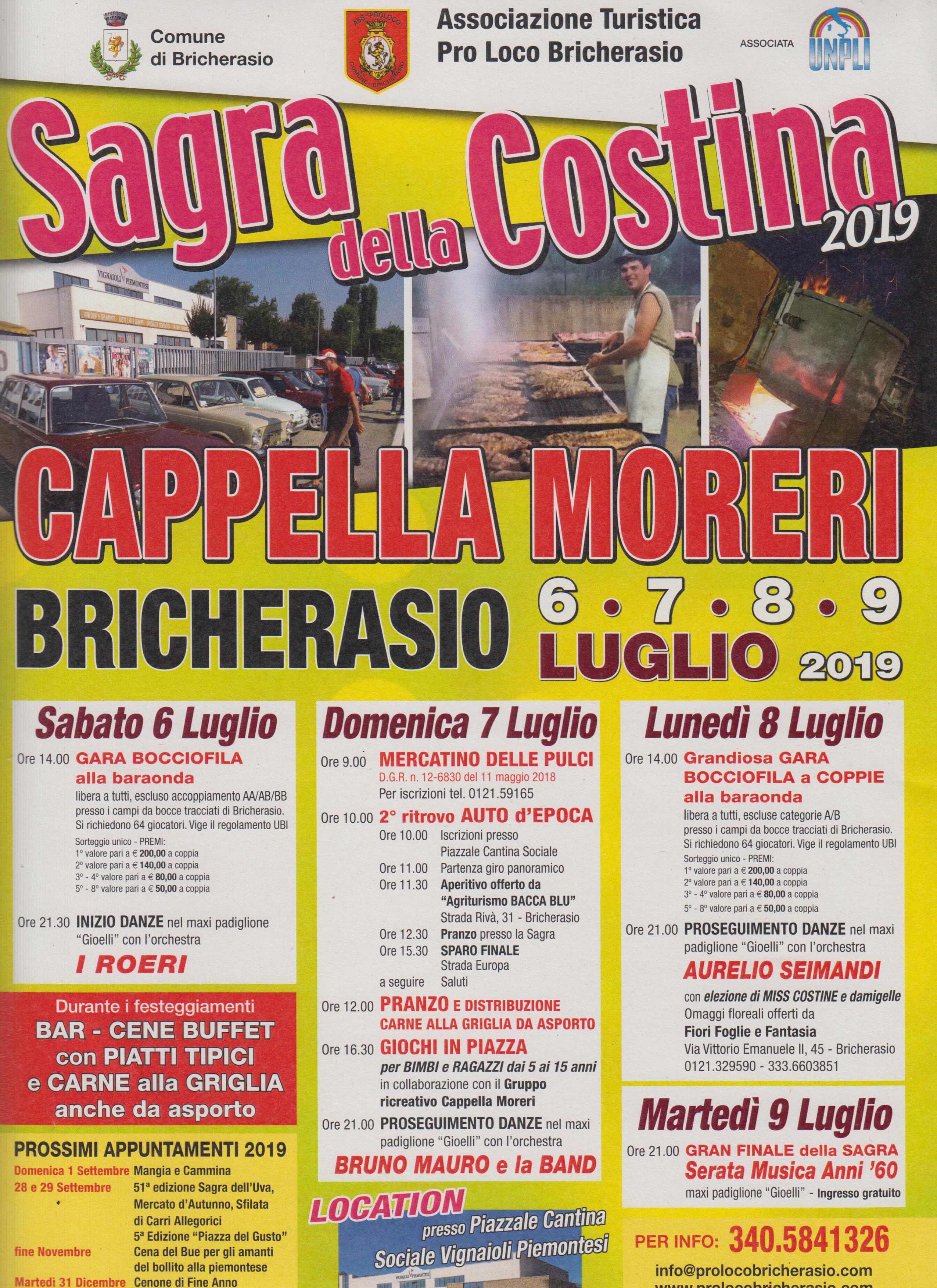 L’Associazione Turistica Pro Loco di Bricherasio organizza per sabato 6, domenica 7, lunedì 8 e martedì 9 luglio a Cappella Moreri la 45^ edizione della “Sagra della costina”, i tradizionali festeggiamenti nella frazione bricherasiese dall'anno scorso spostati presso la nuova location del piazzale della Cantina Sociale Vignaioli Piemontesi. In programma il secondo raduno d’auto d’epoca previsto per le ore 10 di Domenica 7 luglio. Già da sabato 6 alle ore 14 sui campi tracciati di Piazza Santa Maria del capoluogo bricherasiese gara bocciofila alla baraonda libera a tutti. Alle 19,30 distribuzione di carne alla griglia, bar e cena con piatti tipici e alle 21,30 inizio danze con l’orchestra ”I Roeri”. Domenica alle ore 9 il via al classico mercatino delle pulci. Alle ore 10 inizia il sopracitato raduno d’auto d’epoca con il ritrovo nel piazzale della Cantina Sociale, a cui segue la partenza per un giro panoramico e alle 11,30 l’aperitivo offerto dall’agriturismo Bacca Blu di Bricherasio. Ai partecipanti è prevista la possibilità di pranzare alla Sagra. Alle ore 12 comincia la distribuzione del pranzo a base di costine e di piatti tipici anche da asporto e alle 16,30 giochi in piazza per bimbi e ragazzi con il Gruppo Ricreativo Cappella Moreri. Per cena assado e a seguire proseguimento danze con l’orchestra ”Bruno Mauro e la band". Lunedì 8 la festa prosegue alle ore 14 con la gara bocciofila a coppie alla baraonda libera a tutti escluse categorie Ae B sempre con sorteggio unico dove si richiedono 64 giocatori. Sempre lunedì la serata di ballo liscio con l’Orchestra “Aurelio Seimandi” e l’elezione di Miss Costine e damigelle con un gradito omaggio floreale offerto da Fiori Foglie e Fantasia di Bricherasio. Il martedì cena di chiusura e il gran finale della Sagra con la serata di musica anni '60 ad ingresso libero. Per informazioni: info@prolocobricherasio.com oppure 340-5841326.