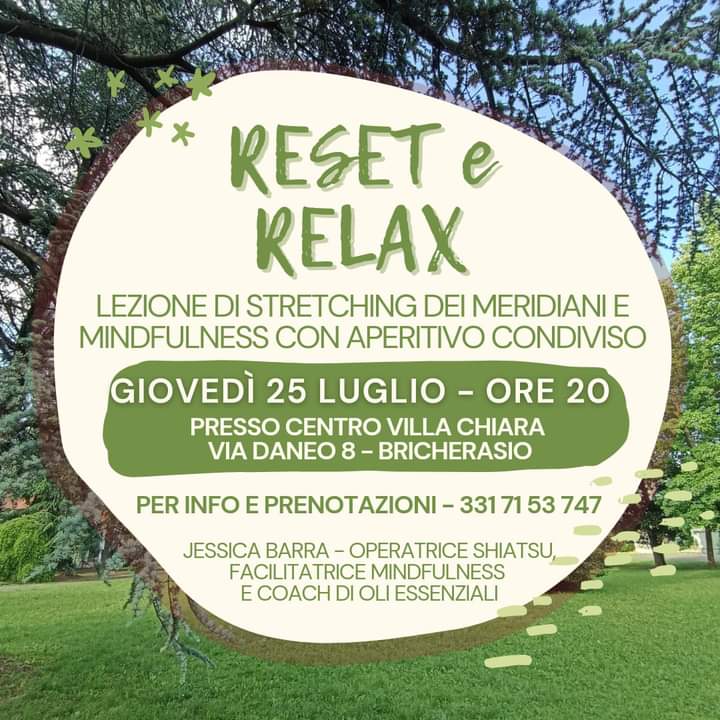 Per chi desidera prendersi una pausa dal ritmo della vita quotidiana e rigenerare corpo e mente l’Associazione Villa Chiara (Via Daneo, 8) a Bricherasio propone per le ore 20 di giovedì 25 luglio presso il proprio centro un'esperienza di rilassamento e movimento dolce del corpo con meditazione mindfulness e stretching dei meridiani, che rilassano il corpo e liberano l’energia vitale. Al termine aperitivo condiviso (ognuno porta qualcosina da stuzzicare) per apprezzare la bellezza della compagnia. Presentarsi con tappetino, cuscino e vestiti con abbigliamento comodo. Il costo della serata è fissato in 15 euro; per informazioni e prenotazioni telefonare a Jessica Barra al numero 331.7153747.