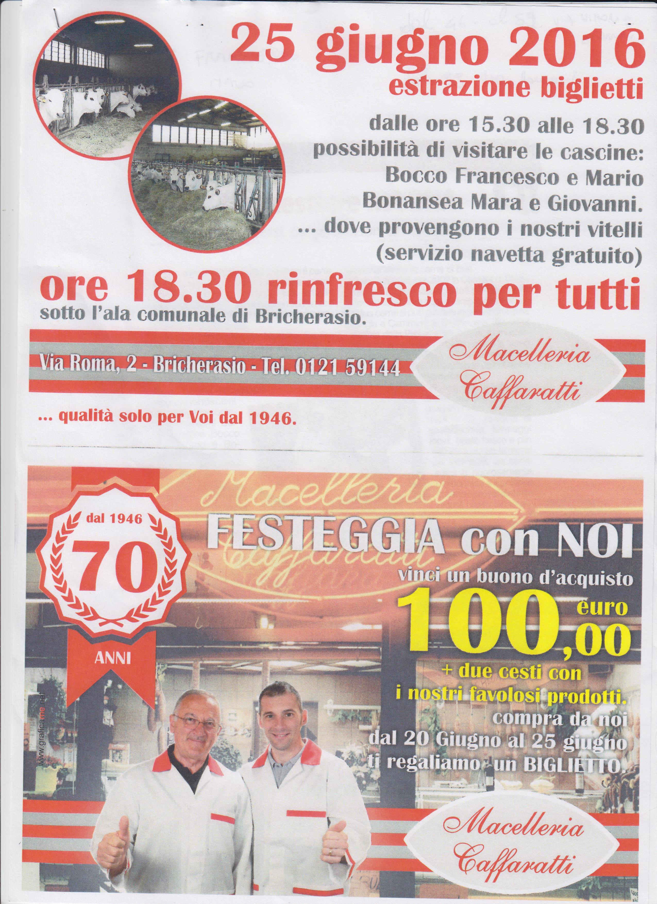 Settant'anni della Macelleria Caffaratti di Bricherasio, che festeggerà l'anniversario dell'attività sabato 25 giugno. “Quando l’amore per un mestiere è parte del DNA...”, questo potrebbe essere l’incipit di un romanzo sulla famiglia Caffaratti, perché tre generazioni, in cui l’amore coniugale va a braccetto con l’amore professionale, sono cosa rara. Francesco e Ida, dal 1946 al 1973, Italo e Miranda dal 1973 al 2010, e Sandro e Paola, dal 2010 ad oggi: nonno, figlio e nipote con le rispettive consorti, tre generazioni di macellai che dal 1946, prima in Via Vittorio Emanuele II e poi in Via Roma, gestiscono la Macelleria a Bricherasio. Per l'occasione, dalle 15,30 alle 18,30, ci sarà la possibilità di visitare, con servizio navetta gratuito, le cascine di Bocco Francesco e Mario, e di Bonansea Mara e Giovanni per vedere da dove provengono i vitelli. Inoltre, per chi comprerà nel negozio da lunedì 20 a sabato 25 giugno, in palio due cesti di prodotti e un buono d’acquisto di 100 €, che verranno sorteggiati proprio il 25 giugno. Previsto un rinfresco per tutti sotto l’Ala comunale a partire dalle 18,30.