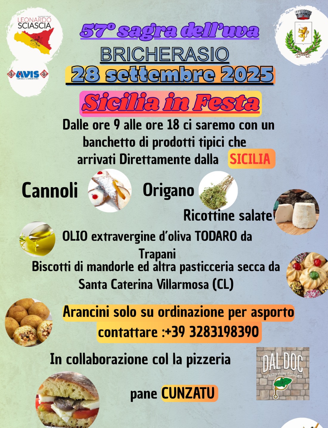 Domenica 28 dalle ore 9 Sicilia in festa proposta dall’Associazione Leonardo Sciascia, un banco di prodotti tipici siciliani come cannoli, ricottine salate, origano, olio, biscotti e, in collaborazione con la pizzeria Dal Doc, pane cunzatu