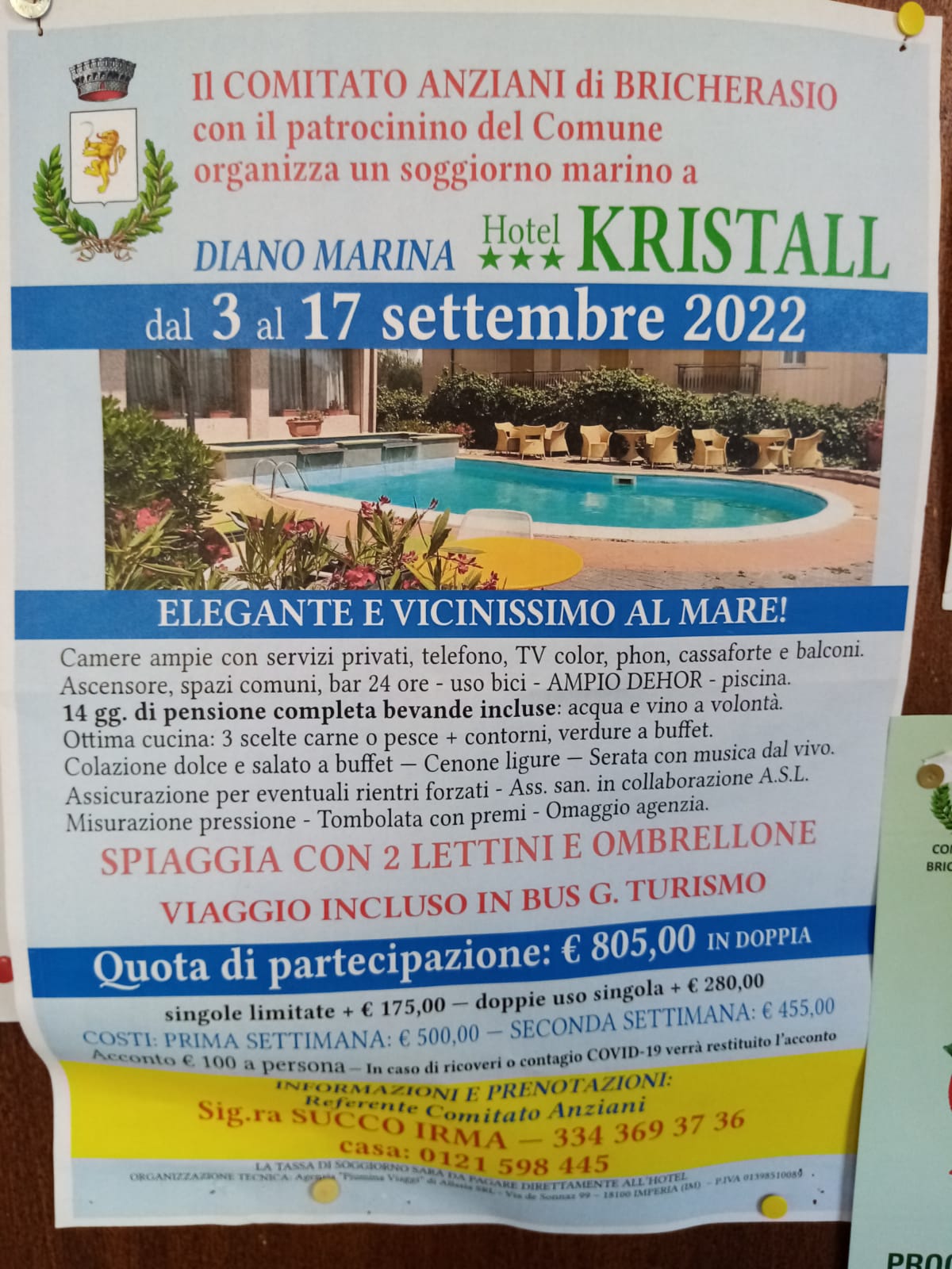 Il Centro Anziani di Bricherasio, con il patrocinio del Comune, organizza il consueto soggiorno marino a Diano Marina (Hotel Kristal) da sabato 3 a sabato 17 settembre. Soggiornare per due settimane nell’elegante e vicinissimo al mare hotel costa 805,00 €. Il prezzo include il viaggio in autobus, pensione completa, spiaggia con ombrelloni e lettini, serate di musica dal vivo e tombolate con ricchi premi. Per informazioni sul soggiorno e prenotazioni telefonare al referente per il centro bricherasiese Irma Succo Franzetti al numero 334/3693736 oppure 0121/598445.