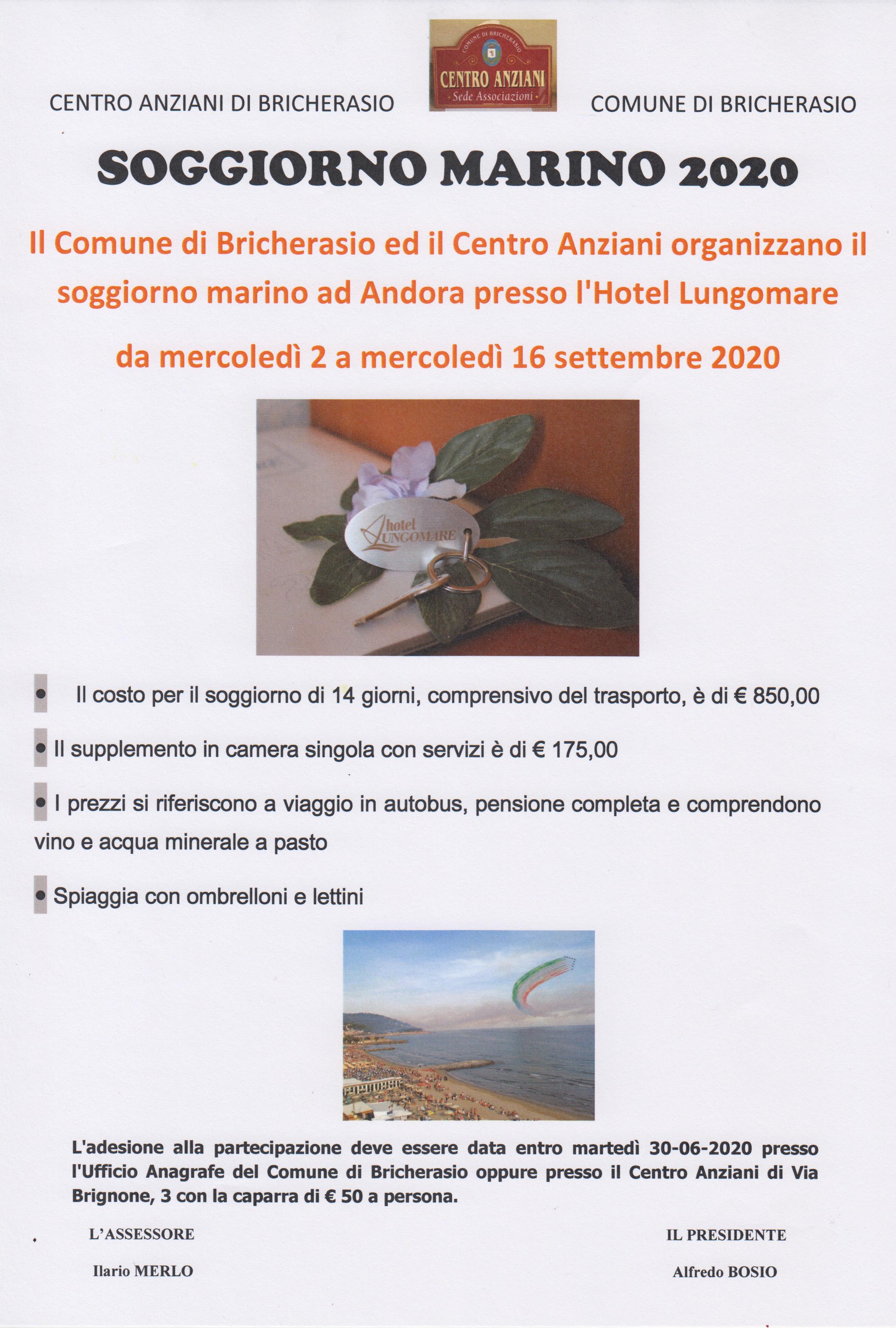 Il Comune di Bricherasio e il Centro Anziani organizzano il consolidato soggiorno marino per anziani ad Andora presso l’Hotel Lungomare da lunedì 2 a lunedì 16 settembre. Il costo per il soggiorno di 14 giorni, comprensivo di trasporto in pullman, è di € 850,00. Il supplemento in camera singola con servizi è di € 175,00. I prezzi si riferiscono a pensione completa e comprendono, oltre al vino e acqua minerale nei pasti, anche la spiaggia con ombrellone e lettini. Informazioni presso l’Ufficio Anagrafe del Comune di Bricherasio, referente Sig.ra Lidia, con la caparra da versare di 50,00 € entro martedì 30 giugno.