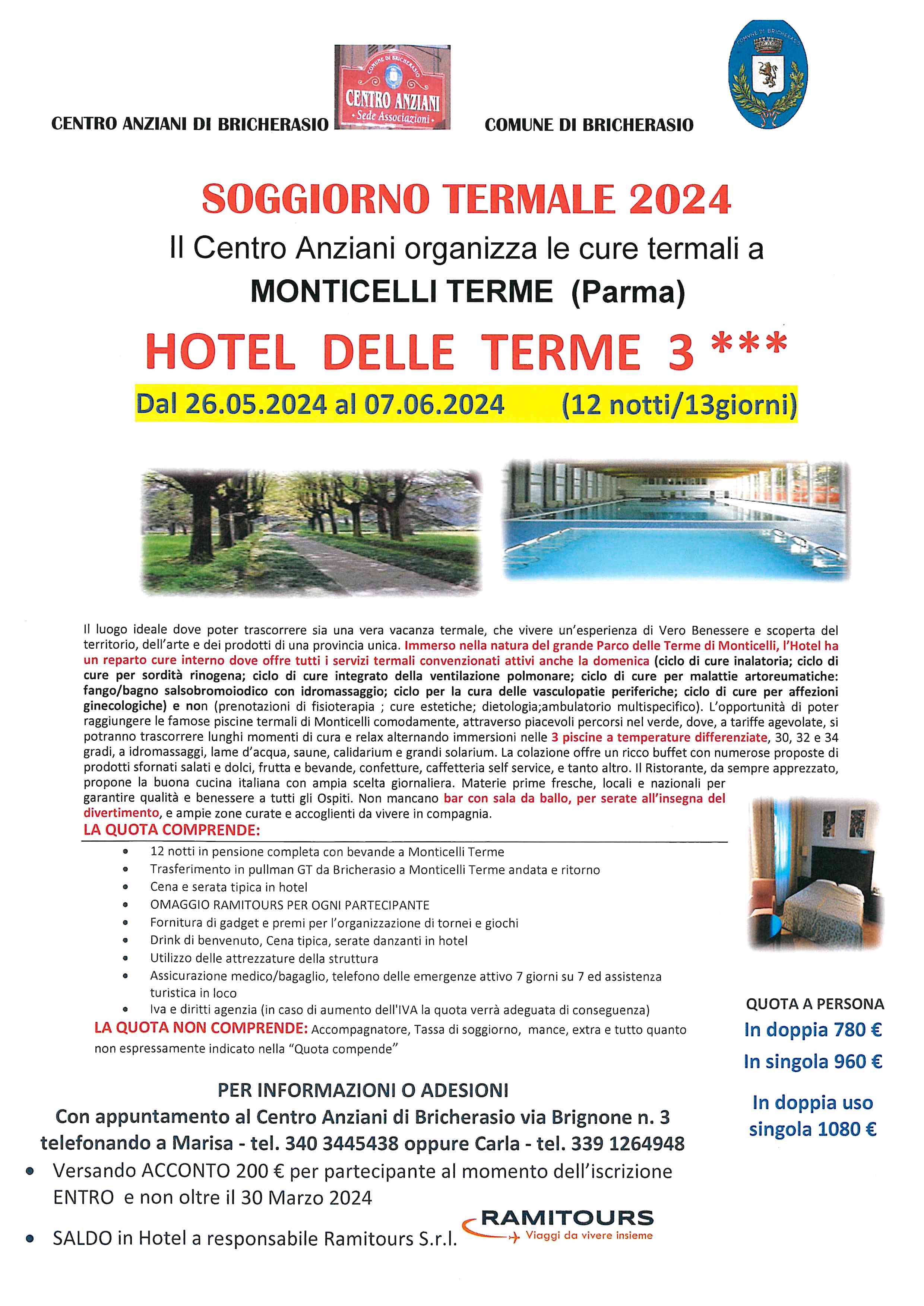 Il Centro Anziani di Bricherasio ha organizzato il tradizionale soggiorno con cure termali a Monticelli Terme, in provincia di Parma, da domenica 26 maggio a venerdì 7 giugno. Il costo per il soggiorno di 13 giorni è di € 780,00 in camera doppia, di € 960,00 nella camera singola e di € 1080,00 per l'uso della camera doppia uso singolo.