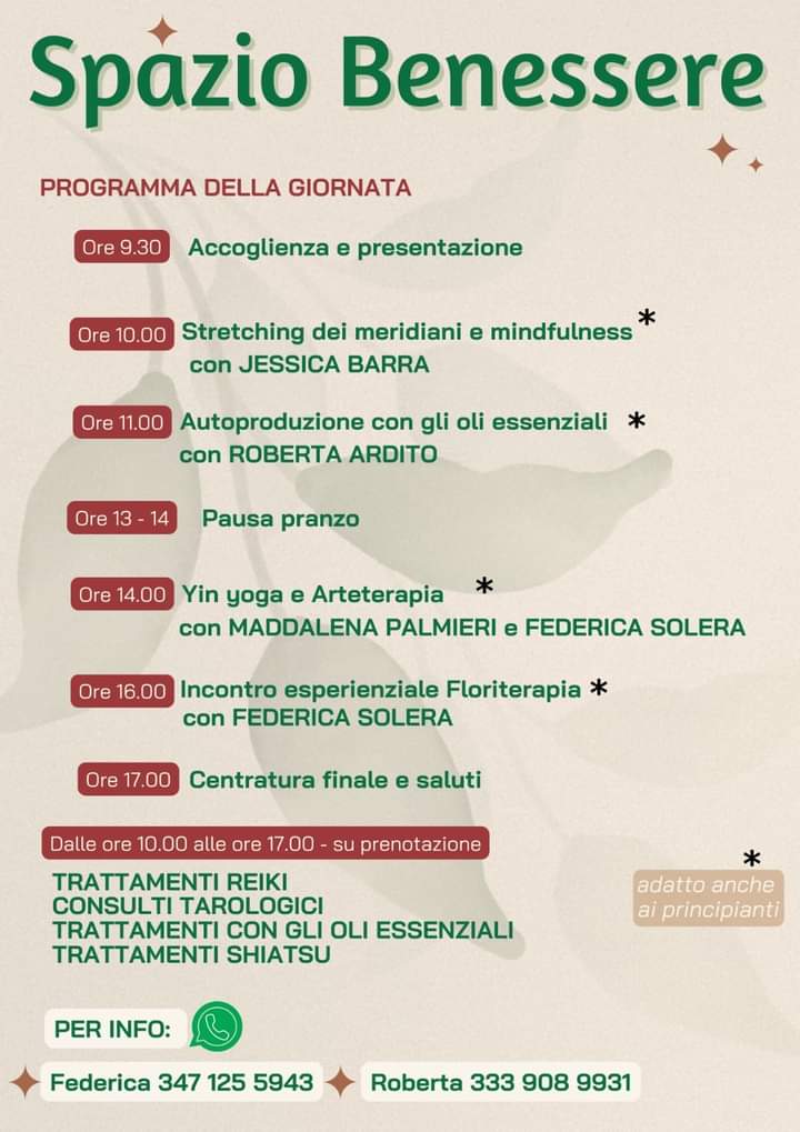 L’Associazione Ricreativa Culturale Villa Chiara, centro per incontri, attività varie e laboratori di Via Daneo, 8 a Bricherasio organizza per Domenica 20 ottobre la seconda edizione dello spazio benessere adatto anche ai principianti. Per tutta la giornata si alternano trattamenti reiki, consulti tarologici, trattamenti shiatsu e con oli essenziali e si possono effettuare laboratori di gruppo con yoga e arteterapia. Il ricco programma comincia alle ore 9,30 con l’accoglienza e la presentazione degli appuntamenti. Alle 10 Jessica Barra conduce lo stretching dei meridiani e il mindfulness per lasciare andare via i pesi e far confluire l’energia mentre alle 11,30 Roberta Ardito presenta l’autoproduzione con gli oli essenziali. Dalle 13 alle 14 la pausa pranzo con la possibilità di mangiare al sacco nella splendida location del parco di Villa Chiara. Nel pomeriggio a partire dalle ore 14 lo Yin yoga e Arteterapia per prepararsi all’autunno con Asana e Mandala del fluire con Maddalena Palmieri e Federica Solera e quest’ultima tiene l’incontro esperienziale di Floriterapia alle 16 per armonizzare il proprio stato d’animo. La giornata si chiude alle 17 con la centratura finale e i saluti e per tutto il giorno su prenotazione sono previsti trattamenti di reiki, shiatsu e massaggi con oli essenziali. I posti sono limitati e prenotazione obbligatoria da Federica al numero 3471255943 e da Roberta al 3339089931.