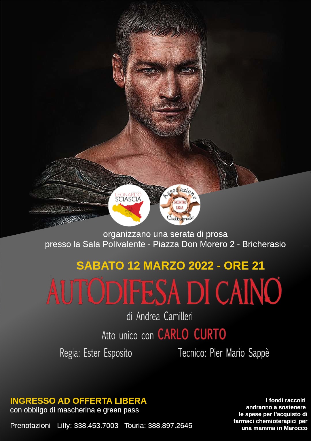Le Associazioni Culturali “Leonardo Sciascia” di Bricherasio" e Liqaa Incontro di Pinerolo invitano tutti a partecipare allo spettacolo di prosa previsto per le ore 21 di sabato 12 marzo al salone Polivalente di Bricherasio: "Autodifesa di Caino" del grande maestro Andrea Camilleri, un atto unico con Carlo Curto e la regia di Ester Esposito. Lilly Di Martino, la Presidente dell'associazione culturale L.Sciascia, al riguardo dice: “Andrea Camilleri se ne è andato il 17 luglio 2019, ci ha lasciato il suo scritto su Caino che aveva completato e per il quale aveva immaginato tutto: la scena e gli intermezzi musicali, i filmati da proiettare sullo schermo, i testi da interpretare di persona e quelli da far recitare. Si tratta di un testo potente, profondo che risponde alle incessanti domande sul bene e il male e affonda le sue radici nella sterminata cultura di Camilleri, nella sua sensibilità letteraria, artistica, musicale, nella sua passione per il mito”..Questo testo ci dà l’opportunità di ricordare e mai dimenticare i diritti e i doveri di tutti ma mai come in questo periodo anche il firitto alla cura, alla salute delle donne. e conclude Lilly “Aiutiamo Saida una ragazza extracomunitaria che ha bisogno di farmaci chemioterapici ma non può acquistarli. La Giornata internazionale dei diritti della donna ricorre l'8 marzo di ogni anno per ricordare sia le conquiste sociali, economiche e politiche, sia le discriminazioni e le violenze di cui le donne sono state e sono ancora oggetto in ogni parte del mondo”. Specialmente in passato e ancora oggi dall'Unione donne italiane e nell'accezione comune viene chiamata Festa della donna anche se è più corretto Giornata internazionale della donna, poiché la motivazione non è la festa ma la riflessione. Ingresso ad offerta libera con obbligo di mascherina e green pass e tutto il ricavato darà devoluto per l’acquisto dei medicinali. Prenotazioni dei posti disponibili al numero 338/4537003 oppure 351/9091290.