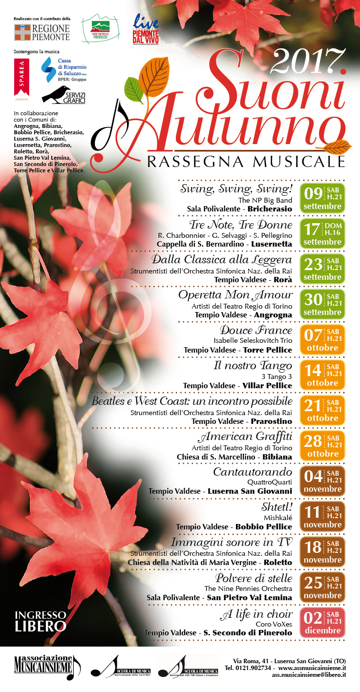 Il concerto inaugurale della rassegna intercomunale Suoni d'autunno 2017 "Swing Swing Swing!" previsto per sabato 9 settembre al Salone Polivalente di Piazza don Morero a Bricherasio vede l’esibizione del gruppo NP Big Band, che arriva da Genova. La NP Big Band, orchestra composta da 17 musicisti e una cantante, è nata nel 2008 per dedicarsi alla musica da ballo Swing delle grandi orchestre americane degli anni ’30 e ’40. Il repertorio attinge principalmente da quello delle orchestre di Benny Goodman, Glenn Miller e Artie Shaw, ma con significative presenze di pezzi di altre grandi orchestre dell’epoca. Le numerose e ripetute partecipazioni ad alcuni fra i più importanti Festival Swing d’Europa (Como Swing Crash, Munich Rock That Swing Festival, Lubiana Sweet Swing Festival, Cannes Balboa on the Promenade, Swing ‘n Milan, Torino Swing Festival, Herrang Dance Camp…) stanno a dimostrare che la NP Big Band, in forza del repertorio nel quale si è specializzata, è diventata un punto di riferimento per tutti i Festival Swing italiani e europei e, nello specifico, non ha oggi rivali in Europa. La serata è ad ingresso libero. L’appuntamento è organizzato dal Comune e dall'Associazione Musicainsieme, con finanziamento dell'Unione Montana del Pinerolese.