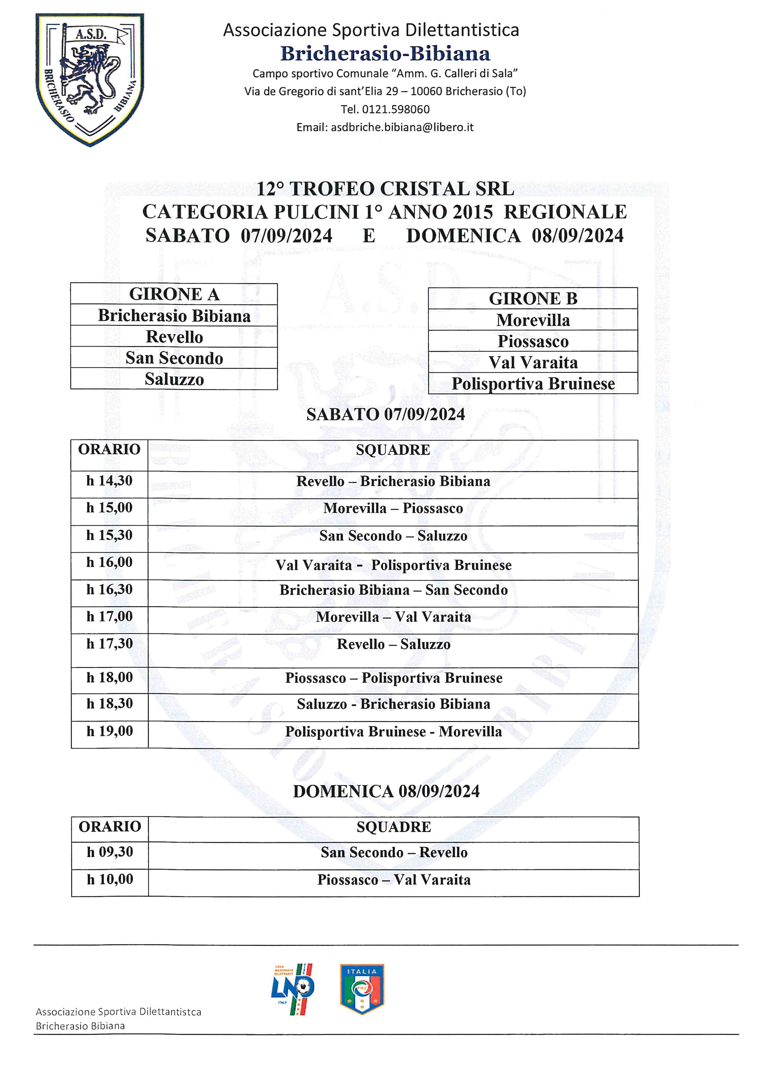 Tutto pronto al campo sportivo “Calleri di Sala” di Bricherasio per l'inaugurazione della stagione calcistica 2024/25 con la 34^ edizione del torneo giovanile di calcio "Comune di Bricherasio" organizzato dalla locale società sportiva. L’occasione per riempire gli spalti degli impianti sportivi è per sabato 7 e domenica 8 settembre con le categorie Pulcini 2014 e Pulcini 2015. I pulcini secondo anno del 2014 a 7 giocatori si contendono il 5^ Trofeo Ceramiche Turina con le compagini del San Secondo, Atletico Racconigi, Scalenghe, Torre Pellice, Revello, Polisportiva Bruinese e Morevilla. Il Direttore Generale della società organizzatrice, Gigi Solito ha predisposto anche il 12^ Trofeo Cristal S.r.l. per la categoria Pulcini primo anno nati nel 2015 e con i padroni di casa del Bricherasio Bibiana seguiti da Tommaso Vottero scendono sul rettangolo di gioco Saluzzo, Revello, San Secondo, Morevilla, Piossasco e Polisportiva Bruinese. Identica la formula dei due tornei. Dopo i quadrangolari all’italiana le prime due di ogni girone si sfideranno in un altro girone all’italiana a quattro squadre denominato oro, mentre le terze e quarte classificate daranno il via al girone argento. Fischio d’inizio della manifestazione alle ore 14,30.