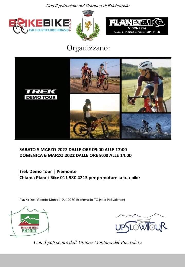 L'associazione ciclistica Brike Bike di Bricherasio in collaborazione con Planet bike di Vigone ed il patrocinio di Comune di Bricherasio ed Unione Montana del Pinerolese organizza per sabato 5 e domenica 6 marzo l'unica tappa piemontese del Trek Demo Tour presso il Salone Polivalente di Piazza Don Morero, a Bricherasio. Il weekend dedicato a prove di e-bike di ultima generazione lungo gli itinerari collinari bricherasiesi sarà un evento promozionale del territorio e della sua vocazione ciclo-turistica. La partecipazione è riservata ai maggiorenni, con i giovani atleti del Brike Bike che fungeranno da ciceroni. Saranno messe a disposizioni bici elettriche, mountain bike e gravel ad uso gratuito. Per maggiori informazioni e prenotazioni chiamare il numero 011/9804213.