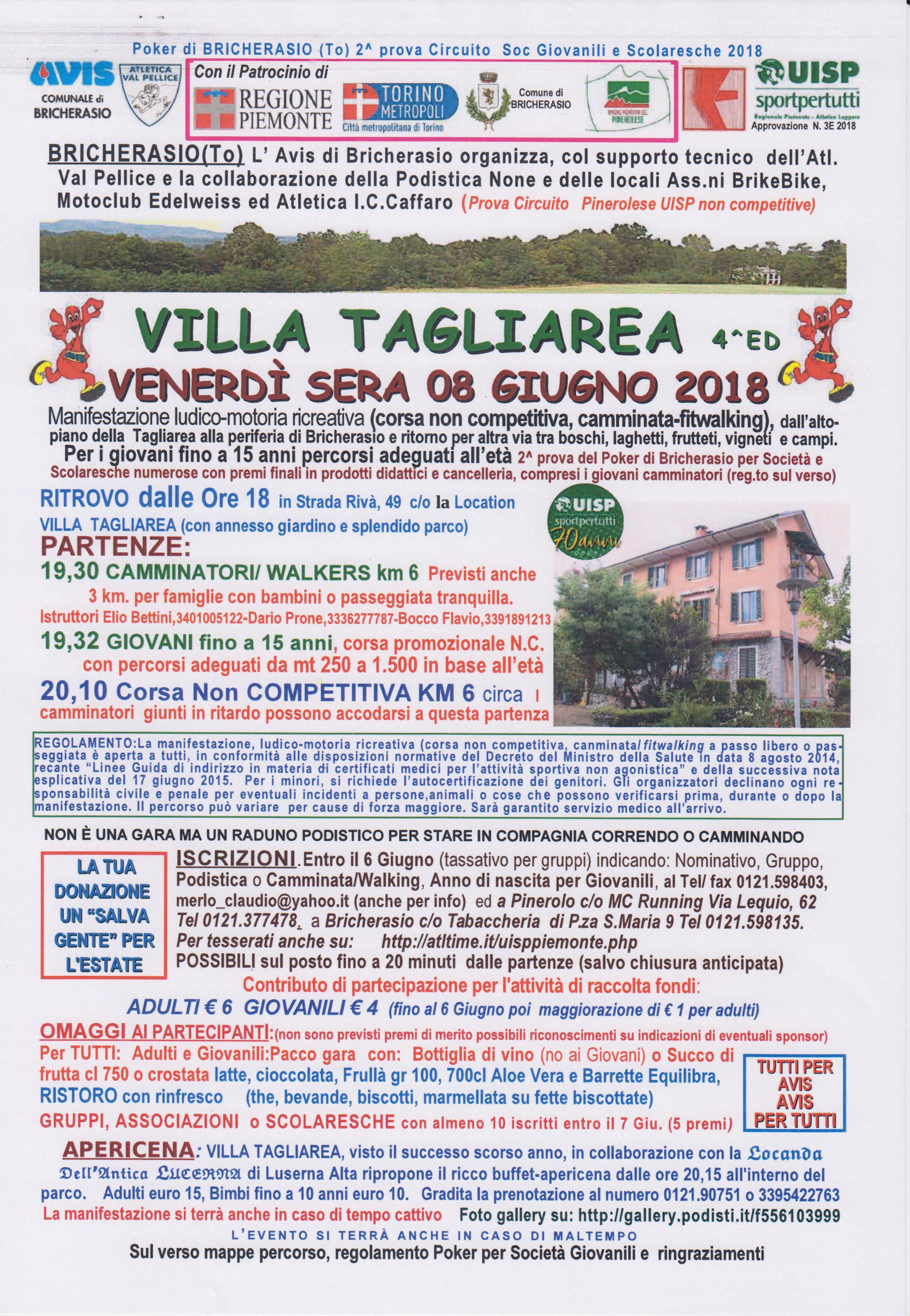 L’ Avis di Bricherasio organizza, col supporto tecnico dell’Atletica Val Pellice e la collaborazione della Podistica None e delle locali Associazioni BrikeBike, Motoclub Edelweiss ed Atletica I. C. Caffaro, per venerdì 8 Giugno una manifestazione ludico-motoria ricreativa facente parte del Circuito Pinerolese UISP non competitive che si snoderà in uno scenario paesaggistico particolarmente suggestivo a stretto contatto con la natura