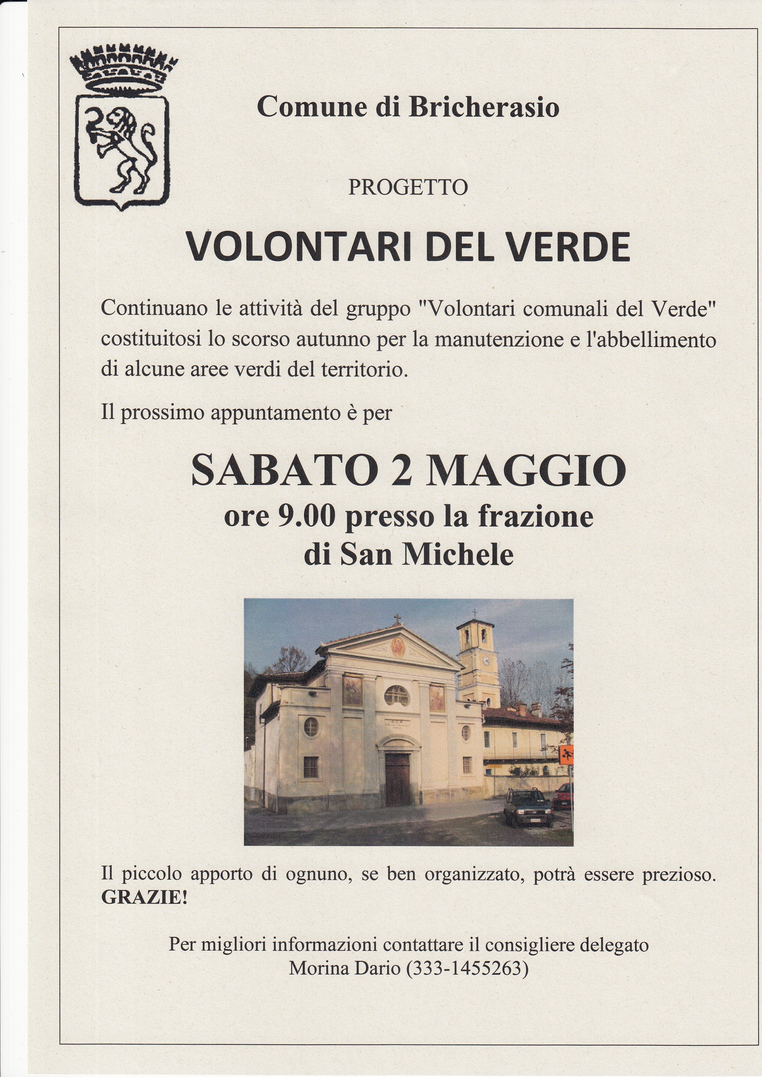 Il Comune di Bricherasio dopo aver presentato a ottobre dello scorso anno il progetto “Volontari comunali del verde” e dopo aver organizzato a metà marzo presso l’area antistante la Chiesa di Santa Caterina un incontro per pulire la frazione di Bricherasio ora il gruppo si ritrova sabato 2 maggio alle ore 9 presso la frazione di San Michele per continuare l’attività per la manutenzione e l’abbellimento delle aree verdi del territorio. Il progetto non si sostituisce all’attività ordinaria di pulizia del paese, ma deve essere un carburante efficiente a mettere in moto il coinvolgimento, a far sentire alla collettività lo scatto etico di cittadini che si mettono all’opera, a mantenere pulito il paese. Non si tratta di una gestione "chiavi in mano" perché rimane costante l'impegno del Servizio Comunale sia nelle fasi di programmazione che in quelle di istruzione e direzione lavori, per fornire supporti logistici e servizi collaterali finalizzati a garantire un buon livello di manutenzione. La gestione del verde attraverso il volontariato organizzato assume pertanto particolare interesse per il raggiungimento dell'obiettivo di un sempre più stringente coinvolgimento dei cittadini nelle scelte per lo sviluppo e qualificazione di una frazione significativa del patrimonio della collettività. Al senso civico che difetta in chi preferisce assegnare al vento la carta delle caramelle, i mozziconi e i fazzoletti usati piuttosto che gettarli nel cestino, si può rispondere con l’educazione e l’impegno di ciascuno. Per maggiori informazioni contattare il consigliere delegato Morina Dario al 333-1455263.