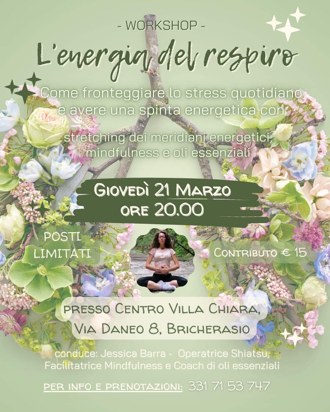A Villa Chiara, centro per incontri, attività varie e laboratori ubicato in Via Daneo, 8 a Bricherasio si organizza per giovedì 21 marzo alle ore 20 un workshop sull’energia del respiro ed equilibrio condotto da Jessica Barra, operatrice Shiatsu, Faciltatrice Mindfulness e Coach di oli essenziali che insegna a fronteggiare lo stress quotidiano e avere una spinta energestica con stretching dei meridiani, Mindfulness e oli essenziali. I posti sono limitati e viene richiesto un contributo di 15 € e per maggiori informazioni e prenotazioni telefonare al numero 3317153747